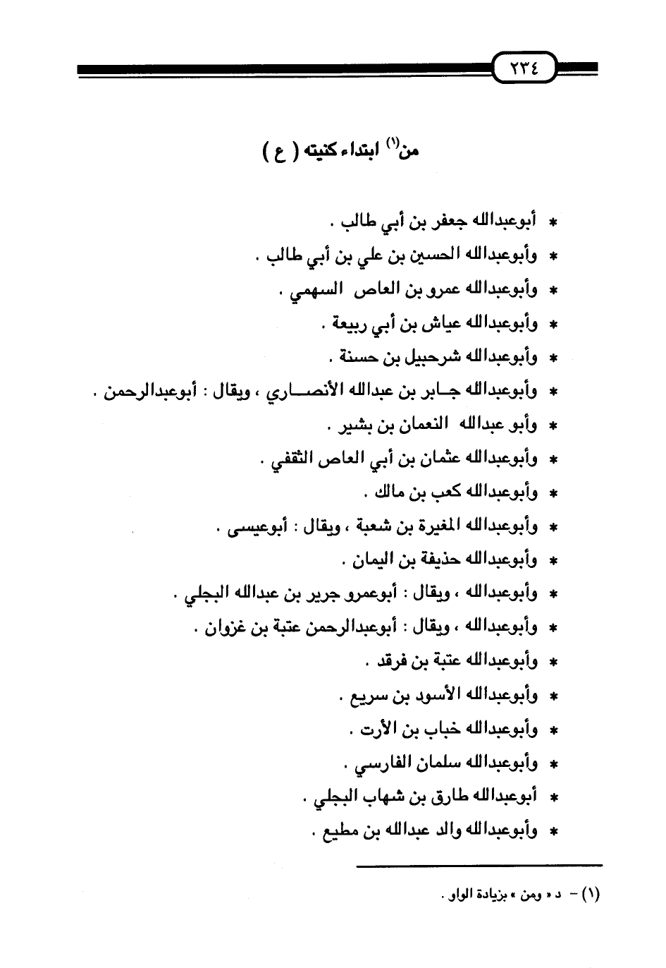 §مَنِ ابْتِدَاءُ كُنْيَتِهِ (ع) أَبُو عَبْدِ اللَّهِ جَعْفَرُ بْنُ أَبِي طَالِبٍ. وَأَبُو عَبْدِ اللَّهِ الْحُسَيْنُ بْنُ عَلِيِّ بْنِ أَبِي طَالِبٍ. وَأَبُو عَبْدِ اللَّهِ عَمْرُو بْنُ الْعَاصِ السَّهْمِيُّ. وَأَبُو عَبْدِ اللَّهِ عَيَّاشُ بْنُ أَبِي رَبِيعَةَ. وَأَبُو عَبْدِ اللَّهِ شُرَحْبِيلُ بْنُ حَسَنَةَ. وَأَبُو عَبْدِ اللَّهِ جَابِرُ بْنُ عَبْدِ اللَّهِ الْأَنْصَارِيُّ وَيُقَالُ: أَبُو عَبْدِ الرَّحْمَنِ. وَأَبُو عَبْدِ اللَّهِ النُّعْمَانُ بْنُ بَشِيرٍ. وَأَبُو عَبْدِ اللَّهِ عُثْمَانُ بْنُ أَبِي الْعَاصِ الثَّقَفِيُّ. وَأَبُو عَبْدِ اللَّهِ كَعْبُ بْنُ مَالِكٍ. وَأَبُو عَبْدِ اللَّهِ الْمُغِيرَةُ بْنُ شُعْبَةَ وَيُقَالُ أَبُو عِيسَى. وَأَبُو عَبْدِ اللَّهِ حُذَيْفَةُ بْنُ الْيَمَانِ. وَأَبُو عَبْدِ اللَّهِ وَيُقَالُ: أَبُو عَمْرٍو جَرِيرُ بْنُ عَبْدِ اللَّهِ الْبَجَلِيُّ. وَأَبُو عَبْدِ اللَّهِ وَيُقَالُ: أَبُو عَبْدِ الرَّحْمَنِ عُتْبَةُ بْنُ غَزْوَانَ. وَأَبُو عَبْدِ اللَّهِ عُتْبَةُ بْنُ فَرْقَدٍ. وَأَبُو عَبْدِ اللَّهِ الْأَسْوَدُ بْنُ سَرِيعٍ. وَأَبُو عَبْدِ اللَّهِ خَبَّابُ بْنُ الْأَرَتِّ. وَأَبُو عَبْدِ اللَّهِ سَلْمَانُ الْفَارِسِيُّ. وَأَبُو عَبْدِ اللَّهِ طَارِقُ بْنُ شِهَابٍ الْبَجَلِيُّ. وَأَبُو عَبْدِ اللَّهِ وَالِدُ عَبْدِ اللَّهِ بْنِ مُطِيعٍ