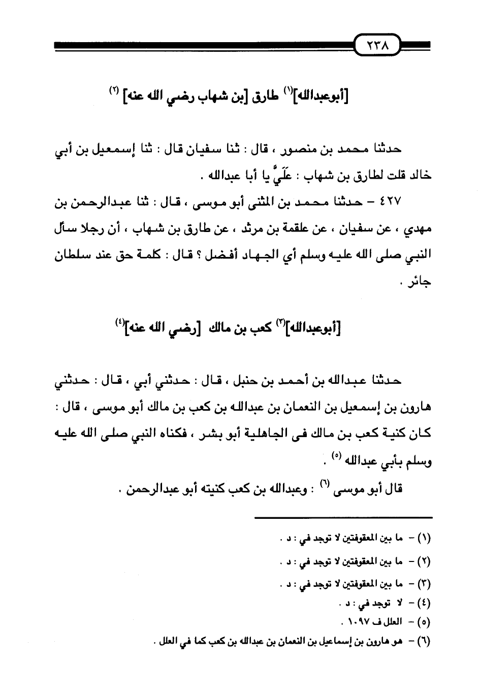 حَدَّثَنَا عَبْدُ اللَّهِ بْنُ أَحْمَدَ بْنِ حَنْبَلٍ قَالَ: حَدَّثَنِي أَبِي قَالَ: حَدَّثَنِي هَارُونُ بْنُ إِسْمَاعِيلَ بْنِ النُّعْمَانِ بْنِ عَبْدِ اللَّهِ بْنِ كَعْبِ بْنِ مَالِكٍ أَبُو مُوسَى قَالَ: «§كَانَ كُنْيَةُ كَعْبِ بْنِ مَالِكٍ فِي الْجَاهِلِيَّةِ أَبُو بِشْرٍ فَكَنَّاهُ النَّبِيُّ صَلَّى اللهُ عَلَيْهِ وَسَلَّمَ بِأَبِي عَبْدِ اللَّهِ» قَالَ أَبُو مُوسَى: وَعَبْدُ اللَّهِ بْنُ كَعْبٍ كُنْيَتُهُ أَبُو عَبْدِ الرَّحْمَنِ