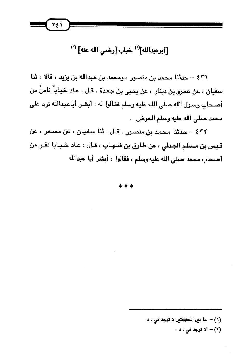 431 - حَدَّثَنَا مُحَمَّدُ بْنُ مَنْصُورٍ وَمُحَمَّدُ بْنُ عَبْدِ اللَّهِ بْنِ يَزِيدَ قَالَا:، ثَنَا سُفْيَانُ , عَنْ عَمْرِو بْنِ دِينَارٍ عَنْ يَحْيَى بْنِ جَعْدَةَ قَالَ: عَادَ خَبَّابًا نَاسٌ مِنْ أَصْحَابِ رَسُولِ اللَّهِ صَلَّى اللهُ عَلَيْهِ وَسَلَّمَ فَقَالُوا لَهُ: «§أَبْشِرْ أَبَا عَبْدِ اللَّهِ تَرِدُ عَلَى مُحَمَّدٍ صَلَّى اللهُ عَلَيْهِ وَسَلَّمَ الْحَوْضَ»