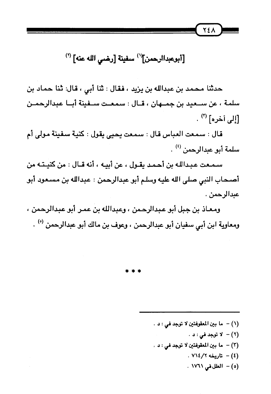 §أَبُو عَبْدِ الرَّحْمَنِ سَفِينَةُ رَضِيَ اللَّهُ عَنْهُ حَدَّثَنَا مُحَمَّدُ بْنُ عَبْدِ اللَّهِ بْنِ يَزِيدَ فَقَالَ: ثنا أَبِي قَالَ: ثنا حَمَّادُ بْنُ سَلَمَةَ، عَنْ سَعِيدِ بْنِ جمهَانَ قَالَ: سَمِعْتُ سَفِينَةَ أَبَا عَبْدِ الرَّحْمَنِ إِلَى آخِرِهِ. قاَلَ: سَمِعْتُ الْعَبَّاسَ قَالَ: سَمِعْتُ يَحْيَى يَقُولُ: كُنْيَةُ سَفِينَةَ مَوْلَى أُمِّ سَلَمَةَ: أَبُو عَبْدِ الرَّحْمَنِ. سَمِعْتُ عَبْدَ اللَّهِ بْنَ أَحْمَدَ يَقُولُ: عَنْ أَبِيهِ، أَنَّهُ قَالَ: مَنْ كُنْيَتُهُ مِنْ أَصْحَابِ النَّبِيِّ صَلَّى اللهُ عَلَيْهِ وَسَلَّمَ أَبُو عَبْدِ الرَّحْمَنِ: عَبْدُ اللَّهِ بْنُ مَسْعُودٍ أَبُو عَبْدِ الرَّحْمَنِ. وَمُعَاذُ بْنُ جَبَلٍ أَبُو عَبْدِ الرَّحْمَنِ، وَعَبْدُ اللَّهِ بْنُ عُمَرَ أَبُو عَبْدِ الرَّحْمَنِ، وَمُعَاوِيَةُ بْنُ أَبِي سُفْيَانَ أَبُو عَبْدِ الرَّحْمَنِ، وَعَوْفُ بْنُ مَالِكٍ أَبُو عَبْدِ الرَّحْمَنِ