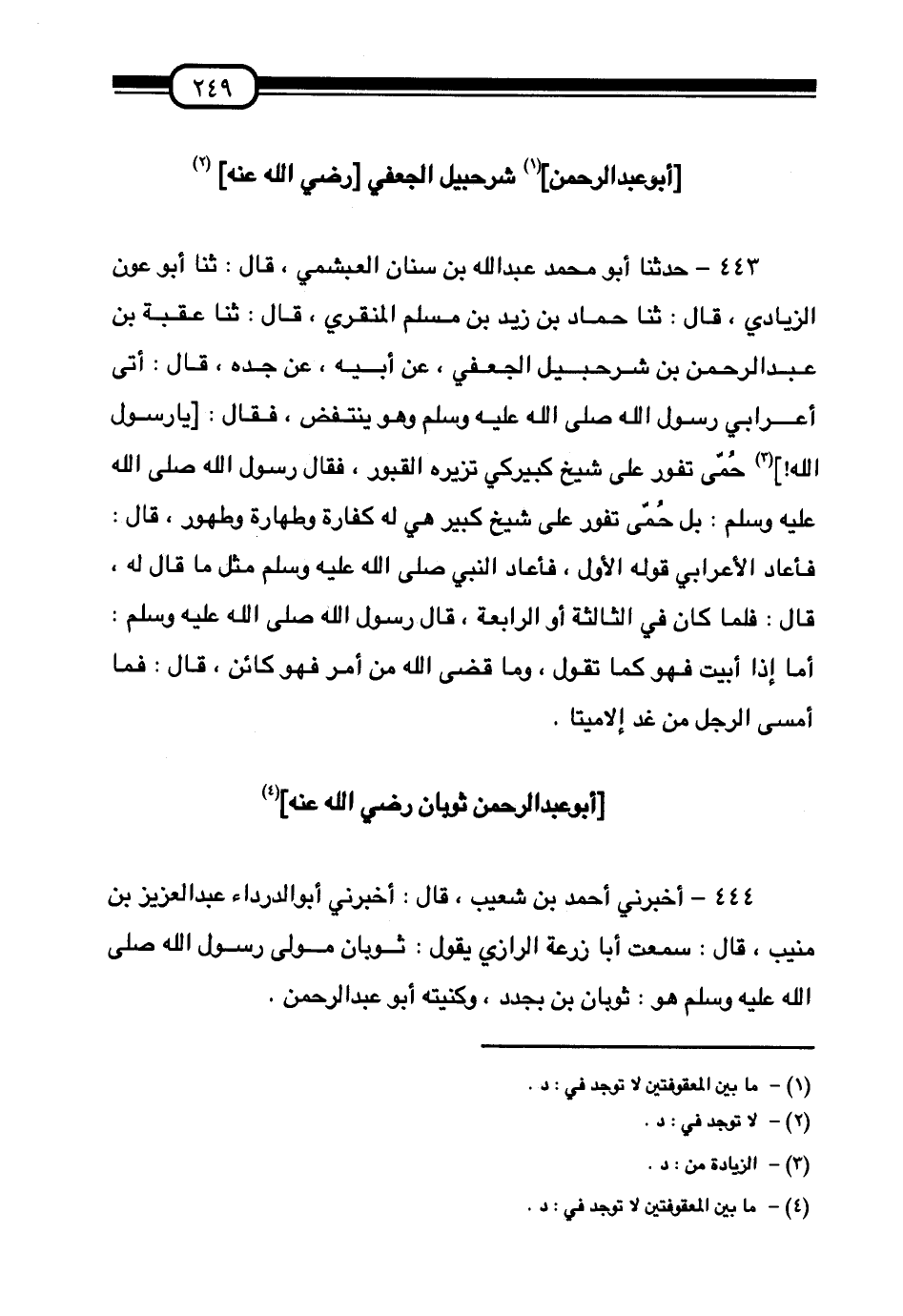 444 - أَخْبَرَنِي أَحْمَدُ بْنُ شُعَيْبٍ قَالَ: أَخْبَرَنِي أَبُو الدَّرْدَاءِ عَبْدُ الْعَزِيزِ بْنُ مُنِيبٍ قَالَ: سَمِعْتُ أَبَا زُرْعَةَ الرَّازِيَّ يَقُولُ: " §ثَوْبَانُ مَوْلَى رَسُولِ اللَّهِ صَلَّى اللهُ عَلَيْهِ وَسَلَّمَ هُوَ: ثَوْبَانُ بْنُ بُجْدُدٍ، وَكُنْيَتُهُ أَبُو عَبْدِ الرَّحْمَنِ "