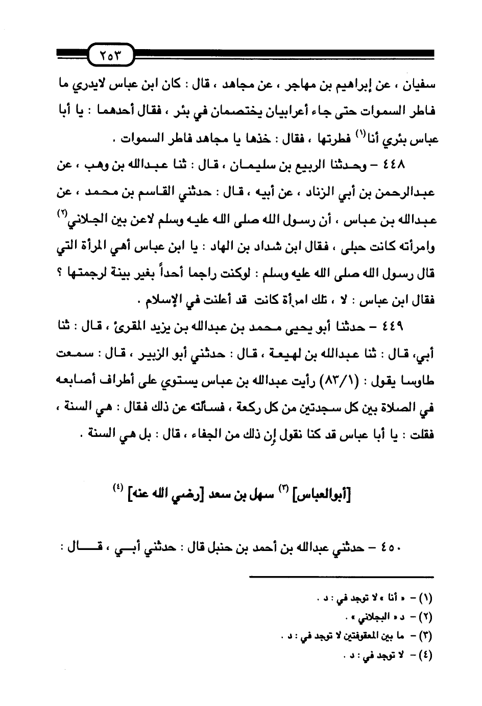 450 - حَدَّثَنِي عَبْدُ اللَّهِ بْنُ أَحْمَدَ بْنِ حَنْبَلٍ قَالَ: حَدَّثَنِي أَبِي قَالَ -[254]-: حَدَّثَنِي يُونُسُ بْنُ مُحَمَّدٍ قَالَ، ثنا عَبْدُ الرَّحْمَنِ بْنُ الْغُسَيْلِ قَالَ: رَأَيْتُ أَبَا الْعَبَّاسِ سَهْلَ بْنِ سَعْدِ بْنِ مَالِكٍ السَّاعِدِيَّ §يُغَيِّرُ لِحْيَتَهُ بِالْحِنَّاءِ أَوْ بِالصُّفْرَةِ , قَالَ: وَرَأَيْتُ شَعْرَهُ أَسْفَلَ مِنْ أُذُنِهِ