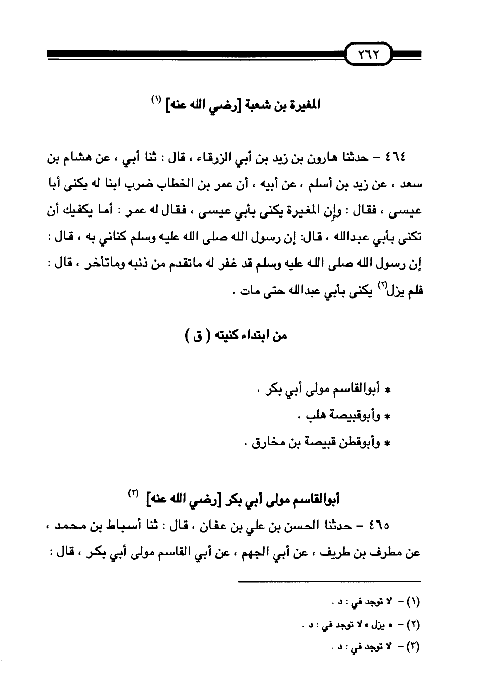 §مَنِ ابْتِدَاءُ كُنْيَتِهِ (ق) أَبُو الْقَاسِمِ مَوْلَى أَبِي بَكْرٍ. وَأَبُو قَبِيصَةَ هُلْبٌ. وَأَبُو قَطَنٍ قَبِيصَةُ بْنُ مُخَارِقٍ.
