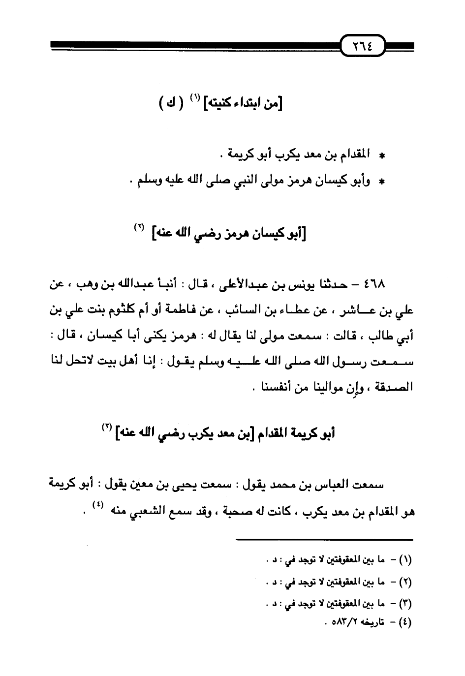 §مَنِ ابْتِدَاءُ كُنْيَتِهِ (ك) الْمِقْدَامُ بْنُ مَعْدِي كَرِبَ أَبُو كَرِيمَةَ. وَأَبُو كَيْسَانَ هُرْمُزُ مَوْلَى النَّبِيِّ صَلَّى اللهُ عَلَيْهِ وَسَلَّمَ
