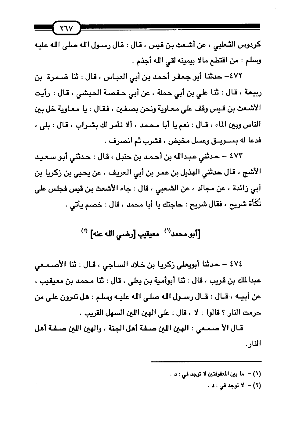474 - حَدَّثَنَا أَبُو يَعْلَى زَكَرِيَّا بْنُ خَلَّادٍ السَّاجِيُّ قَالَ:، ثَنَا الْأَصْمَعِيُّ عَبْدُ الْمَلِكِ بْنُ قَرِيبٍ قَالَ:، ثَنَا أَبُو أُمَيَّةَ بْنُ يَعْلَى قَالَ:، ثَنَا مُحَمَّدُ بْنُ مُعَيْقِيبٍ , عَنْ أَبِيهِ قَالَ: قَالَ رَسُولُ اللَّهِ صَلَّى اللهُ عَلَيْهِ وَسَلَّمَ: «§هَلْ تَدْرُونَ عَلَى مَنْ حُرِّمَتِ النَّارُ» ؟ قَالُوا: لَا. قَالَ: «عَلَى الْهَيِّنِ اللَّيِّنِ السَّهْلِ الْقَرِيبِ» قَالَ الْأَصْمَعِيُّ: الْهَيِّنُ اللَّيِّنُ صِفَةُ أَهْلِ الْجَنَّةِ، وَالْهَيِّنُ اللَّيِّنُ صِفَةُ أَهْلِ النَّارِ