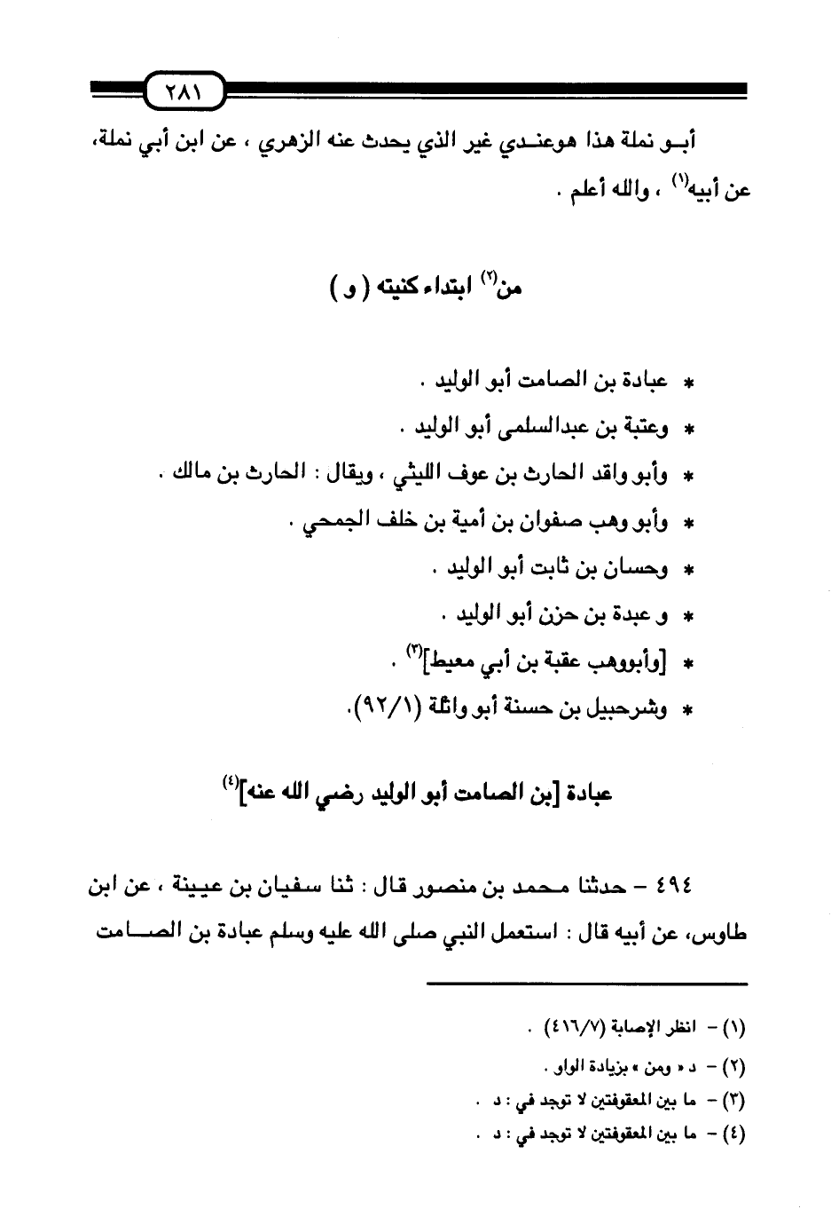§مَنِ ابْتِدَاءُ كُنْيَتِهِ «و» عُبَادَةُ بْنُ الصَّامِتِ أَبُو الْوَلِيدِ. وَعُتْبَةُ بْنُ عَبْدٍ السُّلَمِيُّ أَبُو الْوَلِيدِ. وَأَبُو وَاقِدٍ الْحَارِثُ بْنُ عَوْفٍ اللَّيْثِيُّ، وَيُقَالُ: الْحَارِثُ بْنُ مَالِكٍ. وَأَبُو وَهْبٍ صَفْوَانُ بْنُ أُمَيَّةَ بْنِ خَلَفٍ الْجُمَحِيُّ. وَحَسَّانُ بْنُ ثَابِتٍ أَبُو الْوَلِيدِ. وَعَبْدَةُ بْنُ حَزَنٍ أَبو الْوَلِيدِ. وَأَبُو وَهْبٍ عُقْبَةُ بْنُ أَبِي مُعَيْطٍ. وَشُرَحْبِيلُ بْنُ حَسَنَةَ أَبُو وَاثِلَةَ.