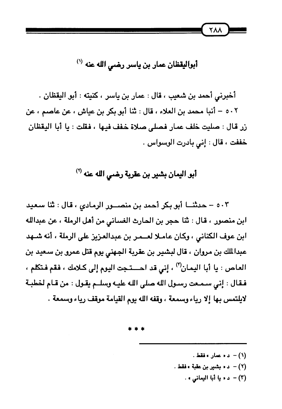 §أَبُو الْيَقْظَانِ عَمَّارُ بْنُ يَاسِرٍ رَضِيَ اللَّهُ عَنْهُ أَخْبَرَنِي أَحْمَدُ بْنُ شُعَيْبٍ قَالَ: عَمَّارُ بْنُ يَاسِرٍ كُنْيَتُهُ: أَبُو الْيَقْظَانِ