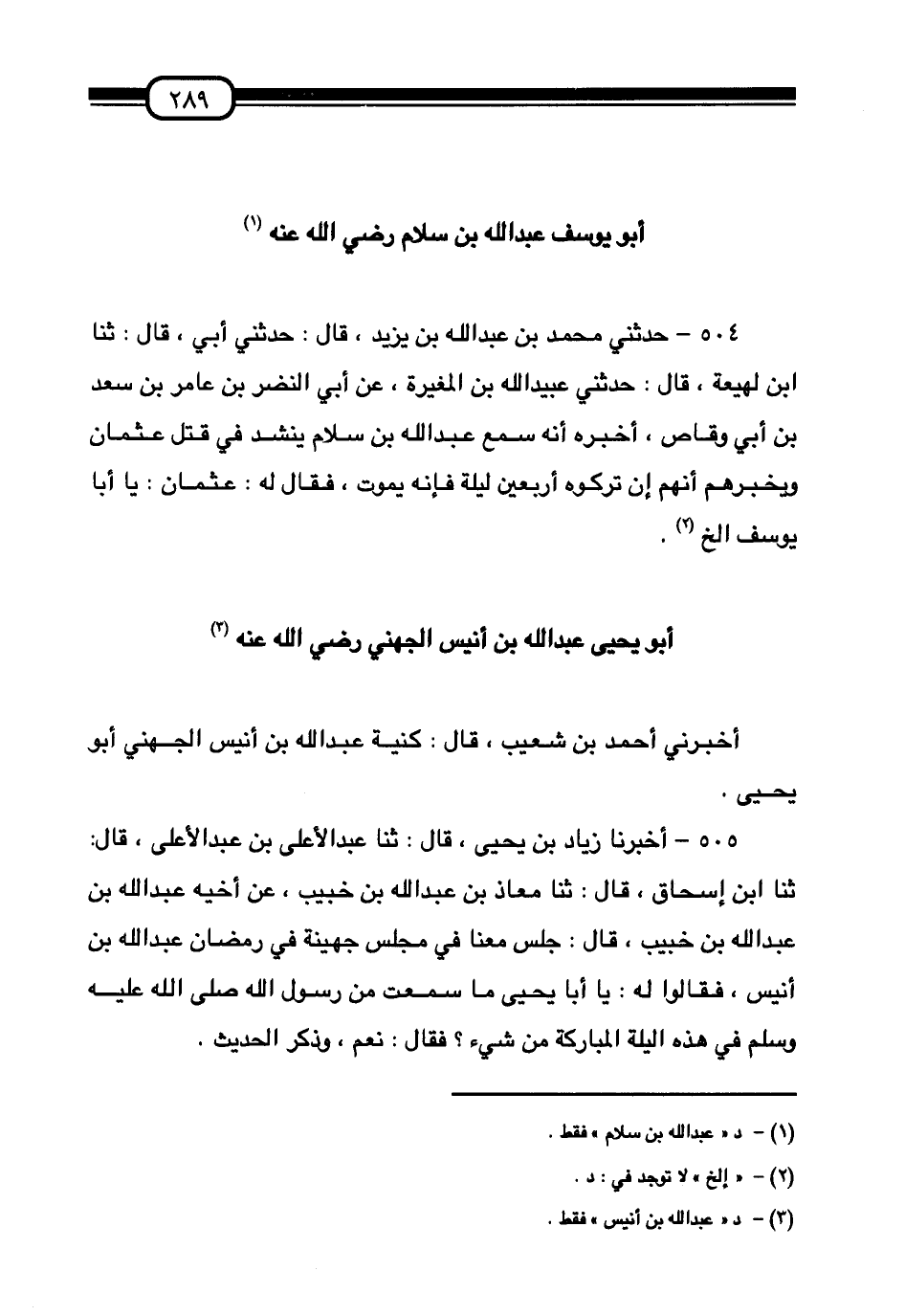 505 - أَخْبَرَنَا زِيَادُ بْنُ يَحْيَى قَالَ: ثنا عَبْدُ الْأَعْلَى بْنُ عَبْدِ الْأَعْلَى قَالَ: ثنا ابْنُ إِسْحَاقَ قَالَ: ثنا مُعَاذُ بْنُ عَبْدِ اللَّهِ بْنِ خُبَيْبٍ، عَنْ أَخِيهِ عَبْدِ اللَّهِ بْنِ عَبْدِ اللَّهِ بْنِ خُبَيْبٍ قَالَ: جَلَسَ مَعَنَا فِي مَجْلِسِ جُهَيْنَةَ فِي رَمَضَانَ عَبْدُ اللَّهِ بْنُ أُنَيْسٍ، فَقَالُوا لَهُ: يَا أَبَا يَحْيَى §مَا سَمِعْتَ مِنْ رَسُولِ اللَّهِ صَلَّى اللَّهِ عَلَيْهِ وَسَلَّمَ فِي هَذِهِ اللَّيْلَةِ الْمُبَارَكَةِ مِنْ شَيْءٍ؟ فَقَالَ: «نَعَمْ» ، وَذَكَرَ الْحَدِيثَ -[290]-. حَدَّثَنَا عَبْدُ اللَّهِ بْنُ أَحْمَدَ بْنِ حَنْبَلٍ، عَنْ أَبِيهِ قَالَ: «عَبْدُ اللَّهِ بْنُ أُنَيْسٍ كُنْيَتُهُ أَبُو يَحْيَى»