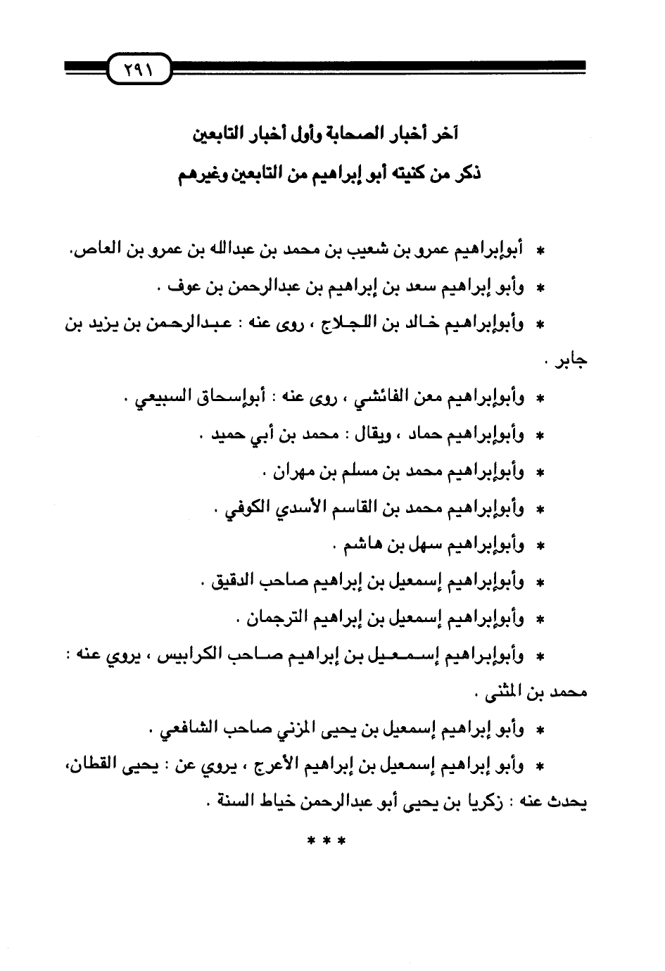 §ذِكْرُ مَنْ كُنْيَتُهُ أَبُو إِبْرَاهِيمَ مِنَ التَّابِعِينَ وَغَيْرِهِمْ أَبُو إِبْرَاهِيمَ عَمْرُو بْنُ شُعَيْبِ بْنِ مُحَمَّدِ بْنِ عَبْدِ اللَّهِ بْنِ عَمْرِو بْنِ الْعَاصِ. وَأَبُو إِبْرَاهِيمَ سَعْدُ بْنُ إِبْرَاهِيمَ بْنِ عَبْدِ الرَّحْمَنِ بْنِ عَوْفٍ. وَأَبُو إِبْرَاهِيمَ خَالِدُ بْنُ اللَّجْلَاجِ، رَوَى عَنْهُ: عَبْدُ الرَّحْمَنِ بْنُ يَزِيدَ بْنِ جَابِرٍ. وَأَبُو إِبْرَاهِيمَ مَعْنٌ الْفَائِشِيُّ، رَوَى عَنْهُ: أَبُو إِسْحَاقَ السَّبِيعِيُّ. وَأَبُو إِبْرَاهِيمَ حَمَّادٌ، وَيُقَالُ: مُحَمَّدُ بْنُ أَبِي حُمَيْدٍ. وَأَبُو إِبْرَاهِيمَ مُحَمَّدُ بْنُ مُسْلِمِ بْنِ مِهْرَانَ. وَأَبُو إِبْرَاهِيمَ مُحَمَّدُ بْنُ الْقَاسِمِ الْأَسَدِيُّ الْكُوفِيُّ. وَأَبُو إِبْرَاهِيمَ سَهْلُ بْنُ هَاشِمٍ. وَأَبُو إِبْرَاهِيمَ إِسْمَاعِيلُ بْنُ إِبْرَاهِيمَ صَاحِبُ الدَّقِيقِ. وَأَبُو إِبْرَاهِيمَ إِسْمَاعِيلُ بْنُ إِبْرَاهِيمَ التُّرْجُمَانُ. وَأَبُو إِبْرَاهِيمَ إِسْمَاعِيلُ بْنُ إِبْرَاهِيمَ صَاحِبُ الْكَرَابِيسِ، يَرْوِي عَنْهُ مُحَمَّدُ بْنُ الْمُثَنَّى. وَأَبُو إِبْرَاهِيمَ إِسْمَاعِيلُ بْنُ يَحْيَى الْمُزَنِيُّ صَاحِبُ الشَّافِعِيُّ. وَأَبُو إِبْرَاهِيمَ إِسْمَاعِيلُ بْنُ إِبْرَاهِيمَ الْأَعْرَجُ، يَرْوِي عَنْ يَحْيَى الْقَطَّانِ، يُحَدِّثُ عَنْهُ: زَكَرِيَّا بْنُ يَحْيَى أَبُو عَبْدِ الرَّحْمَنِ خَيَّاطُ السُّنَّةِ. .