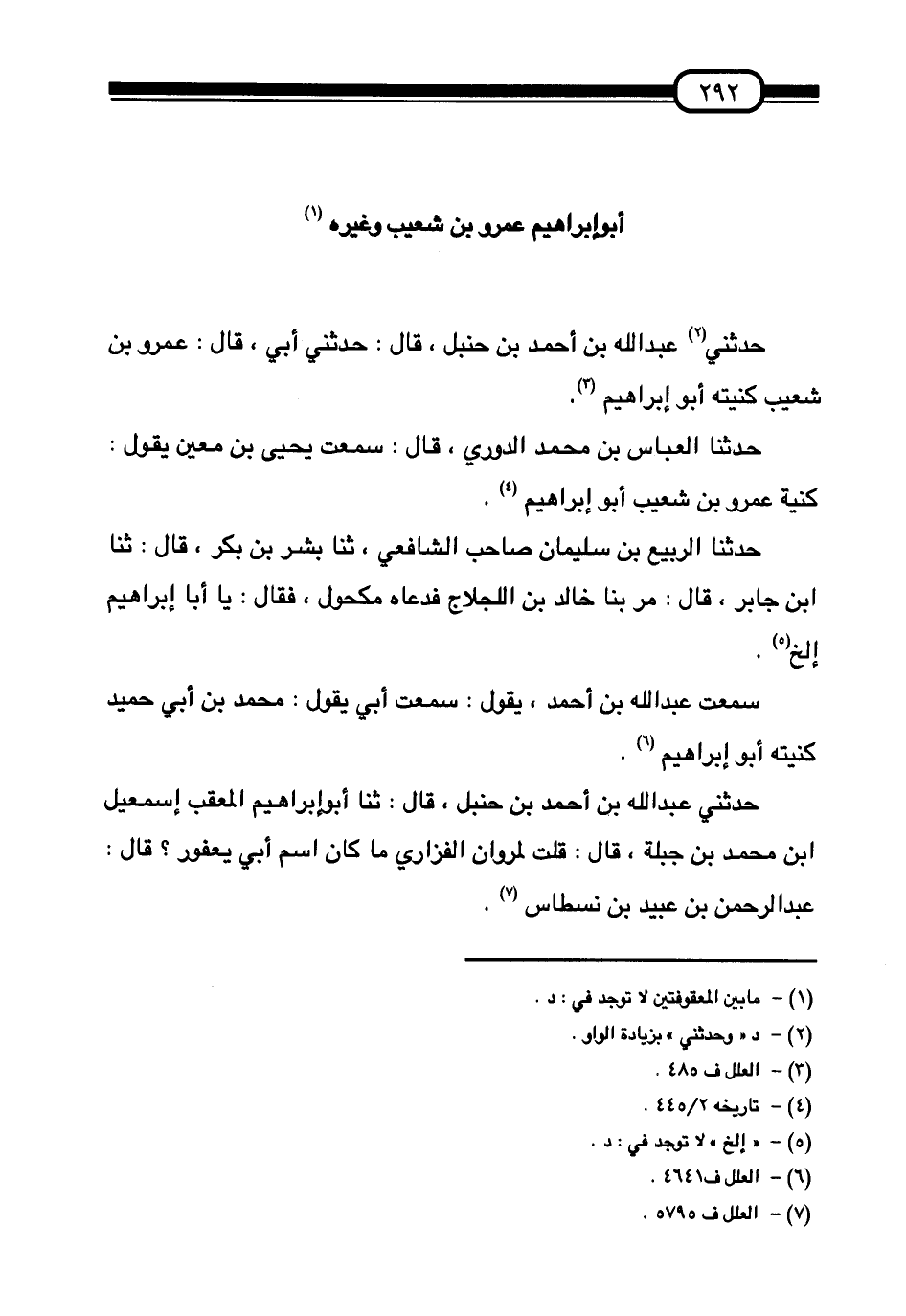 §أَبُو إِبْرَاهِيمَ عَمْرُو بْنُ شُعَيْبٍ وَغَيْرُهُ حَدَّثَنِي عَبْدُ اللَّهِ بْنُ أَحْمَدَ بْنِ حَنْبَلٍ، قَالَ: حَدَّثَنِي أَبِي قَالَ: عَمْرُو بْنُ شُعَيْبٍ كُنْيَتُهُ أَبُو إِبْرَاهِيمَ. حَدَّثَنَا الْعَبَّاسُ بْنُ مُحَمَّدٍ الدُّورِيُّ، قَالَ: سَمِعْتُ يَحْيَى بْنَ مَعِينٍ يَقُولُ: كُنْيَةُ عَمْرِو بْنِ شُعَيْبٍ: أَبُو إِبْرَاهِيمَ. حَدَّثَنَا الرَّبِيعُ بْنُ سُلَيْمَانَ صَاحِبُ الشَّافِعِيُّ، ثنا بِشْرُ بْنُ بَكْرٍ، قَالَ: ثنا ابْنُ جَابِرٍ قَالَ: مَرَّ بِنَا خَالِدُ بْنُ اللَّجْلَاجِ فَدَعَاهُ مَكْحُولٌ فَقَالَ: يَا أَبَا إِبْرَاهِيمَ إلخ. سَمِعْتُ عَبْدَ اللَّهِ بْنَ أَحْمَدَ يَقُولُ: سَمِعْتُ أَبِي يَقُولُ: مُحَمَّدُ بْنُ أَبِي حُمَيْدٍ كُنْيَتُهُ أَبُو إِبْرَاهِيمَ. حَدَّثَنِي عَبْدُ اللَّهِ بْنُ أَحْمَدَ بْنِ حَنْبَلٍ قَالَ: ثنا أَبُو إِبْرَاهِيمَ الْمُعَقِّبُ إِسْمَاعِيلُ بْنُ مُحَمَّدِ بْنِ جَبَلَةَ قَالَ: قُلْتُ لَمَرْوَانَ الْفَزَارِيِّ مَا كَانَ اسْمُ أَبِي يَعْفُورٍ؟ قَالَ: عَبْدُ الرَّحْمَنِ بْنُ عُبَيْدِ بْنِ نِسْطَاسٍ.