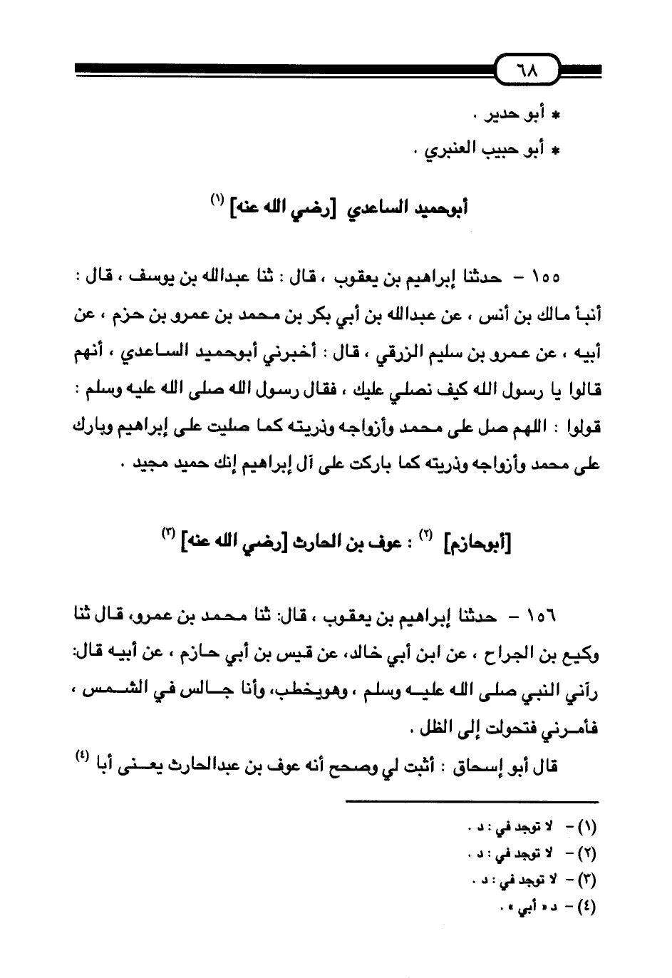 155 - حَدَّثَنَا إِبْرَاهِيمُ بْنُ يَعْقُوبَ قَالَ:، ثَنَا عَبْدُ اللَّهِ بْنُ يُوسُفَ قَالَ: أَنْبَأَ مَالِكُ بْنُ أَنَسٍ، عَنْ عَبْدِ اللَّهِ بْنِ أَبِي بَكْرِ بْنِ مُحَمَّدِ بْنِ عَمْرِو بْنِ حَزْمٍ، عَنْ أَبِيهِ عَنْ عَمْرِو بْنِ سُلَيْمٍ الزُّرَقِيِّ قَالَ: أَخْبَرَنِي أَبُو حُمَيْدٍ السَّاعِدِيُّ أَنَّهُمْ قَالُوا: يَا رَسُولَ اللَّهِ §كَيْفَ نُصَلِّي عَلَيْكَ؟ فَقَالَ رَسُولُ اللَّهِ صَلَّى اللهُ عَلَيْهِ وَسَلَّمَ: " قُولُوا: اللَّهُمَّ صَلِّ عَلَى مُحَمَّدٍ وَأَزْوَاجِهِ وَذُرِّيَّتِهِ كَمَا صَلَّيْتَ عَلَى إِبْرَاهِيمَ وَبَارِكْ عَلَى مُحَمَّدٍ وَأَزْوَاجِهِ وَذُرِّيَّتِهِ كَمَا بَارَكْتَ عَلَى آلِ إِبْرَاهِيمَ إِنَّكَ حَمِيدٌ مَجِيدٌ "