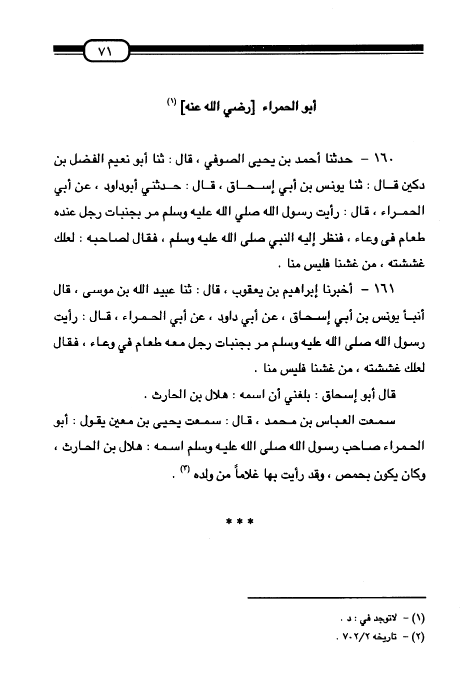 161 - أَخْبَرَنَا إِبْرَاهِيمُ بْنُ يَعْقُوبَ قَالَ:، ثَنَا عُبَيْدُ اللَّهِ بْنُ مُوسَى قَالَ: أَنْبَأَ يُونُسُ بْنُ أَبِي إِسْحَاقَ، عَنْ أَبِي دَاوُدَ , عَنْ أَبِي الْحَمْرَاءِ قَالَ: رَأَيْتُ رَسُولَ اللَّهِ صَلَّى اللهُ عَلَيْهِ وَسَلَّمَ مَرَّ بِجَنَبَاتِ رَجُلٍ مَعَهُ طَعَامٌ فِي وِعَاءٍ فَقَالَ: «لَعَلَّكَ غَشَشْتَهُ §مَنْ غَشَّنَا فَلَيْسَ مِنَّا» . قَالَ أَبُو إِسْحَاقَ: بَلَغَنِي أَنَّ اسْمَهُ هِلَالُ بْنُ الْحَارِثِ. سَمِعْتُ الْعَبَّاسَ بْنَ مُحَمَّدٍ يَقُولُ: سَمِعْتُ يَحْيَى بْنَ مَعِينٍ يَقُولُ: " أَبُو الْحَمْرَاءِ صَاحِبُ رَسُولِ اللَّهِ صَلَّى اللهُ عَلَيْهِ وَسَلَّمَ اسْمُهُ: هِلَالُ بْنُ الْحَارِثِ، وَكَانَ يَكُونُ بِحِمْصَ وَقَدْ رَأَيْتُ بِهَا غُلَامًا مِنْ وَلَدِهِ "