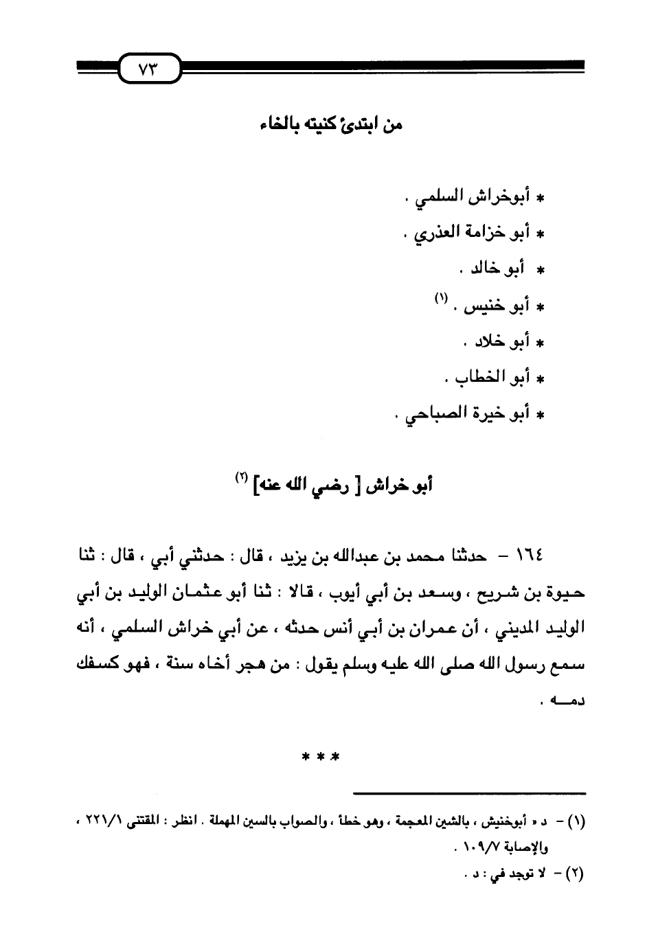 §مَنِ ابْتُدِئَ كُنْيَتُهُ بِالْخَاءِ أَبُو خِرَاشٍ السُّلَمِيُّ. أَبُو خُزَامَةَ الْعُذْرِيُّ. أَبُو خَالِدٍ. أَبُو خُنَيْسٍ. أَبُو خَلَّادٍ. أَبُو الْخَطَّابِ. أَبُو خِيَرَةَ الصَّبَاحِيُّ