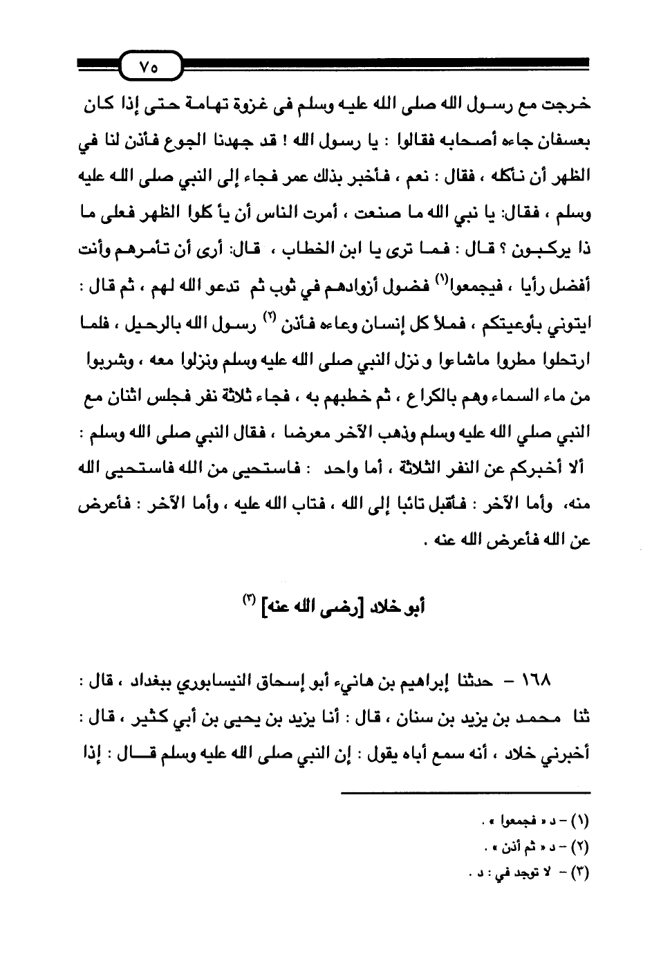 168 - حَدَّثَنَا إِبْرَاهِيمُ بْنُ هَانِئٍ أَبُو إِسْحَاقَ النَّيْسَابُورِيُّ بِبَغْدَادَ قَالَ:، ثَنَا مُحَمَّدُ بْنُ يَزِيدَ بْنِ سِنَانٍ قَالَ: أنا يَزِيدُ عَنْ يَحْيَى بْنِ أَبِي كَثِيرٍ قَالَ: أَخْبَرَنِي خَلَّادٌ أَنَّهُ سَمِعَ أَبَاهُ يَقُولُ: إِنَّ النَّبِيَّ صَلَّى اللهُ عَلَيْهِ وَسَلَّمَ قَالَ: «§إِذَا -[76]- خَرَجَ أَحَدُكُمْ يَتَغَوَّطُ أَوْ يَبُولُ فَلَا يَسْتَقْبِلِ الْقِبْلَةَ وَلَا يَسْتَدْبِرْهَا , وَلَا يَسْتَقْبِلِ الرِّيحَ , وَلْيَتَمَسَّحْ ثَلَاثَ مَرَّاتٍ، وَإِذَا خَرَجَ الرَّجُلَانِ جَمِيعًا فَلْيَتَفَرَّقَا , وَلَا يَجْلِسْ أَحَدُهُمَا قَرِيبًا مِنْ صَاحِبِهِ , وَلَا يَتَحَدَّثَانِ؛ فَإِنَّ اللَّهَ يَمْقُتُ عَلَى ذَلِكَ»