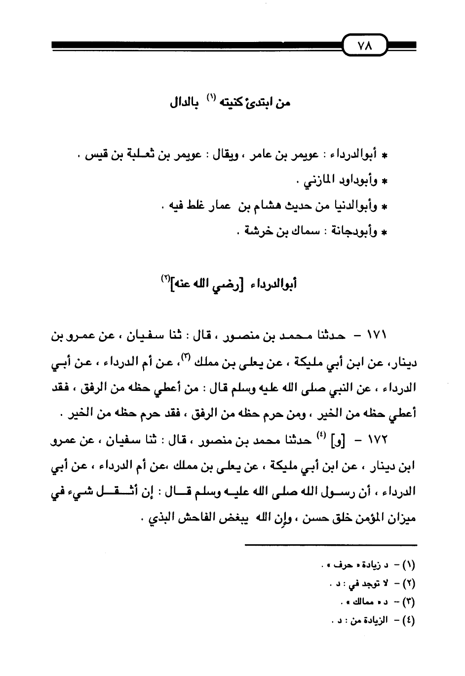 وَحَدَّثَنَا مُحَمَّدُ بْنُ مَنْصُورٍ قَالَ:، ثَنَا سُفْيَانُ، عَنْ عَمْرِو بْنِ دِينَارٍ عَنِ ابْنِ أَبِي مُلَيْكَةَ، عَنْ يَعْلَى بْنِ مَمْلَكٍ، عَنْ أُمِّ الدَّرْدَاءِ عَنْ أَبِي الدَّرْدَاءِ أَنَّ رَسُولَ اللَّهِ صَلَّى اللهُ عَلَيْهِ وَسَلَّمَ قَالَ: «§إِنَّ أَثْقَلَ شَيْءٍ فِي مِيزَانِ الْمُؤْمِنِ خُلُقٌ حَسَنٌ , وَإِنَّ اللَّهَ يُبْغِضُ الْفَاحِشَ الْبَذِيَّ»
