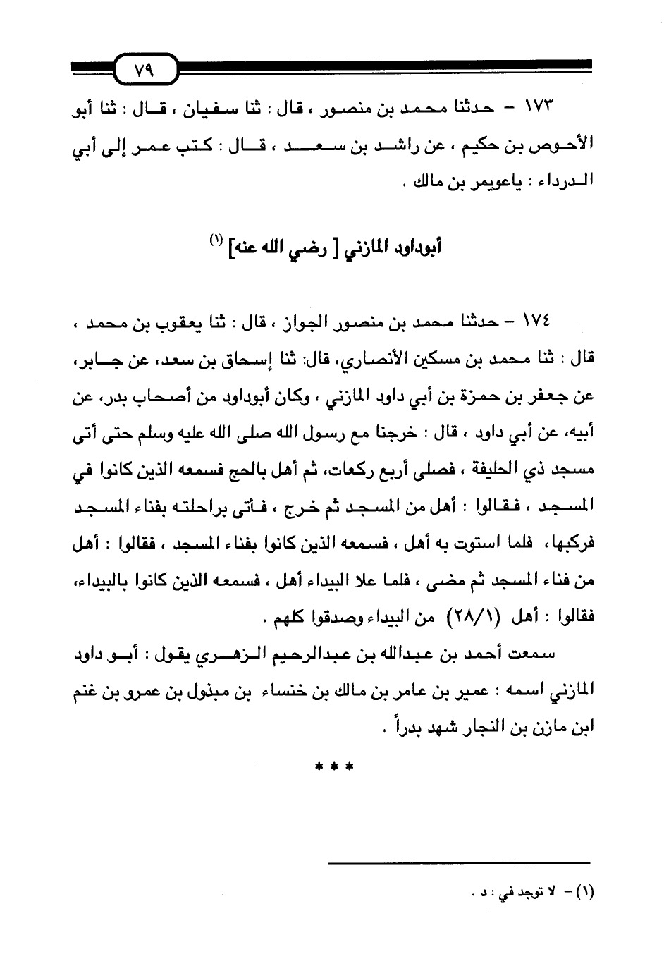 174 - حَدَّثَنَا مُحَمَّدُ بْنُ مَنْصُورٍ الْجَوَّازُ قَالَ:، ثَنَا يَعْقُوبُ بْنُ مُحَمَّدٍ قَالَ:، ثَنَا مُحَمَّدُ بْنُ مِسْكِينٍ الْأَنْصَارِيُّ قَالَ:، ثَنَا إِسْحَاقُ بْنُ سَعْدٍ عَنْ جَابِرٍ، عَنْ جَعْفَرِ بْنِ حَمْزَةَ بْنِ أَبِي دَاوُدَ الْمَازِنِيِّ وَكَانَ أَبُو دَاوُدَ مِنْ أَصْحَابِ بَدْرٍ عَنْ أَبِيهِ عَنْ أَبِي دَاوُدَ قَالَ: " خَرَجْنَا مَعَ رَسُولِ اللَّهِ صَلَّى اللهُ عَلَيْهِ وَسَلَّمَ حَتَّى أَتَى مَسْجِدَ ذِي الْحُلَيْفَةِ فَصَلَّى أَرْبَعَ رَكَعَاتٍ , §ثُمَّ أَهَلَّ بِالْحَجِّ فَسَمِعَهُ الَّذِينَ كَانُوا فِي الْمَسْجِدِ فَقَالُوا: أَهَلَّ مِنَ الْمَسْجِدِ ثُمَّ خَرَجَ فَأُتِيَ بِرَاحِلَتِهِ بِفِنَاءِ الْمَسْجِدِ فَرَكِبَهَا، فَلَمَّا اسْتَوَتْ بِهِ أَهَلَّ فَسَمِعَهُ الَّذِينَ كَانُوا بِفِنَاءِ الْمَسْجِدِ فَقَالُوا أَهَلَّ مِنْ فَنَاءِ الْمَسْجِدِ، ثُمَّ مَضَى فَلَمَّا عَلَا الْبَيْدَاءَ أَهَلَّ فَسَمِعَهُ الَّذِينَ كَانُوا بِالْبَيْدَاءِ فَقَالُوا: أَهَلَّ مِنَ الْبَيْدَاءِ وَصَدَقُوا كُلُّهُمْ ". سَمِعْتُ أَحْمَدَ بْنَ عَبْدِ اللَّهِ بْنِ عَبْدِ الرَّحِيمِ الزُّهْرِيَّ يَقُولُ: " أَبُو دَاوُدَ الْمَازِنِيُّ اسْمُهُ: عُمَيْرُ بْنُ عَامِرِ بْنِ مَالِكِ بْنِ خَنْسَاءَ بْنِ مَبْذُولِ بْنِ عَمْرِو بْنِ غَنْمِ بْنِ مَازِنِ بْنِ النَّجَّارِ شَهِدَ بَدْرًا "
