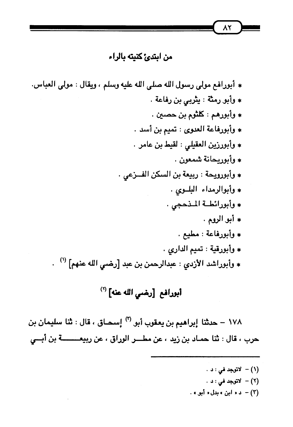 §مَنِ ابْتُدِئَ كُنْيَتُهُ بِالرَّاءِ أَبُو رَافِعٍ مَوْلَى رَسُولِ اللَّهِ صَلَّى اللهُ عَلَيْهِ وَسَلَّمَ، وَيُقَالُ: مَوْلَى الْعَبَّاسِ. وَأَبُو رِمْثَةَ: يَثْرِبِيُّ بْنُ رِفَاعَةَ. وَأَبُو رُهْمٍ: كُلْثُومُ بْنُ حُصَيْنٍ. وَأَبُو رِفَاعَةَ الْعَدَوِيُّ: تَمِيمُ بْنُ أَسَدٍ. وَأَبُو رَزِينٍ الْعَقِيلِيُّ: لَقِيطُ بْنُ عَامِرٍ. وَأَبُو رَيْحَانَةَ شَمْعُونُ. وَأَبُو رُوَيْحَةَ: رَبِيعَةُ بْنُ السَّكَنِ الْفَزَعِيُّ. وَأَبُو الرَّمْدَاءِ الْبَلَوِيُّ. وَأَبُو رَيْطَةَ الْمَذْحِجِيُّ. أَبُو الرُّومِ. وَأَبُو رِفَاعَةَ: مُطِيعٌ. وَأَبُو رُقَيَّةَ: تَمِيمٌ الدَّارِيُّ. وَأَبُو رَاشِدٍ الْأَزْدِيُّ: عَبْدُ الرَّحْمَنِ بْنُ عَبْدٍ رَضِيَ اللَّهُ عَنْهُمْ
