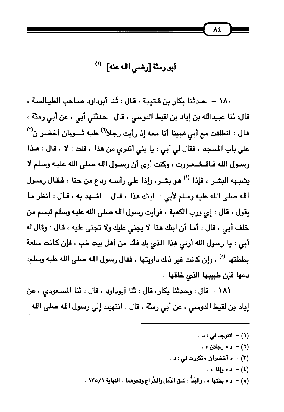 180 - حَدَّثَنَا بَكَّارُ بْنُ قُتَيْبَةَ قَالَ:، ثَنَا أَبُو دَاوُدَ صَاحِبُ الطَّيَالِسَةِ قَالَ:، ثَنَا عُبَيْدُ اللَّهِ بْنُ إِيَادِ بْنِ لَقِيطٍ الدَّوْسِيُّ قَالَ: حَدَّثَنِي أَبِي عَنْ أَبِي رِمْثَةَ قَالَ: انْطَلَقْتُ مَعَ أَبِي فَبَيْنَا أَنَا مَعَهُ إِذْ رَأَيْتُ رَجُلًا عَلَيْهِ ثَوْبَانِ أَخْضَرَانِ عَلَى بَابِ الْمَسْجِدِ فَقَالَ لِي أَبِي: يَا بُنَيَّ أَتَدْرِي مَنْ هَذَا؟ قُلْتُ: لَا. قَالَ: هَذَا رَسُولُ اللَّهِ. فَاقْشَعْرَرْتُ وَكُنْتُ أَرَى أَنَّ رَسُولَ اللَّهِ صَلَّى اللهُ عَلَيْهِ وَسَلَّمَ لَا يُشْبِهُهُ الْبَشَرُ فَإِذَا هُوَ بِشْرٌ وَإِذَا عَلَى رَأْسِهِ رَدْعٌ مِنْ حِنَّاءٍ، فَقَالَ رَسُولُ اللَّهِ صَلَّى اللهُ عَلَيْهِ وَسَلَّمَ لِأَبِي: «ابْنُكَ هَذَا؟» قَالَ: اشْهَدْ بِهِ. قَالَ: «انْظُرْ مَا تَقُولُ» . قَالَ: إِي وَرَبِّ الْكَعْبَةِ، فَرَأَيْتُ رَسُولَ اللَّهِ صَلَّى اللهُ عَلَيْهِ وَسَلَّمَ تَبَسَّمَ مِنْ حَلْفِ أَبِي قَالَ: «أَمَا إِنَّ ابْنَكَ هَذَا لَا يَجْنِي عَلَيْكَ وَلَا تَجْنِي عَلَيْهِ» . قَالَ: وَقَالَ لَهُ أَبِي: يَا رَسُولَ اللَّهِ أَرِنِي هَذَا الَّذِي بِكَ فَأَنَا مِنْ أهْلِ بَيْتِ طِبٍّ فَإِنْ كَانَتْ سَلْعَةً بَطَطْتُهَا وَإِنْ كَانَتْ غَيْرَ ذَلِكَ دَاوَيْتُهَا، فَقَالَ رَسُولُ اللَّهِ صَلَّى اللهُ عَلَيْهِ وَسَلَّمَ: «§دَعْهَا فَإِنَّ طَبِيبَهَا الَّذِي خَلَقَهَا»