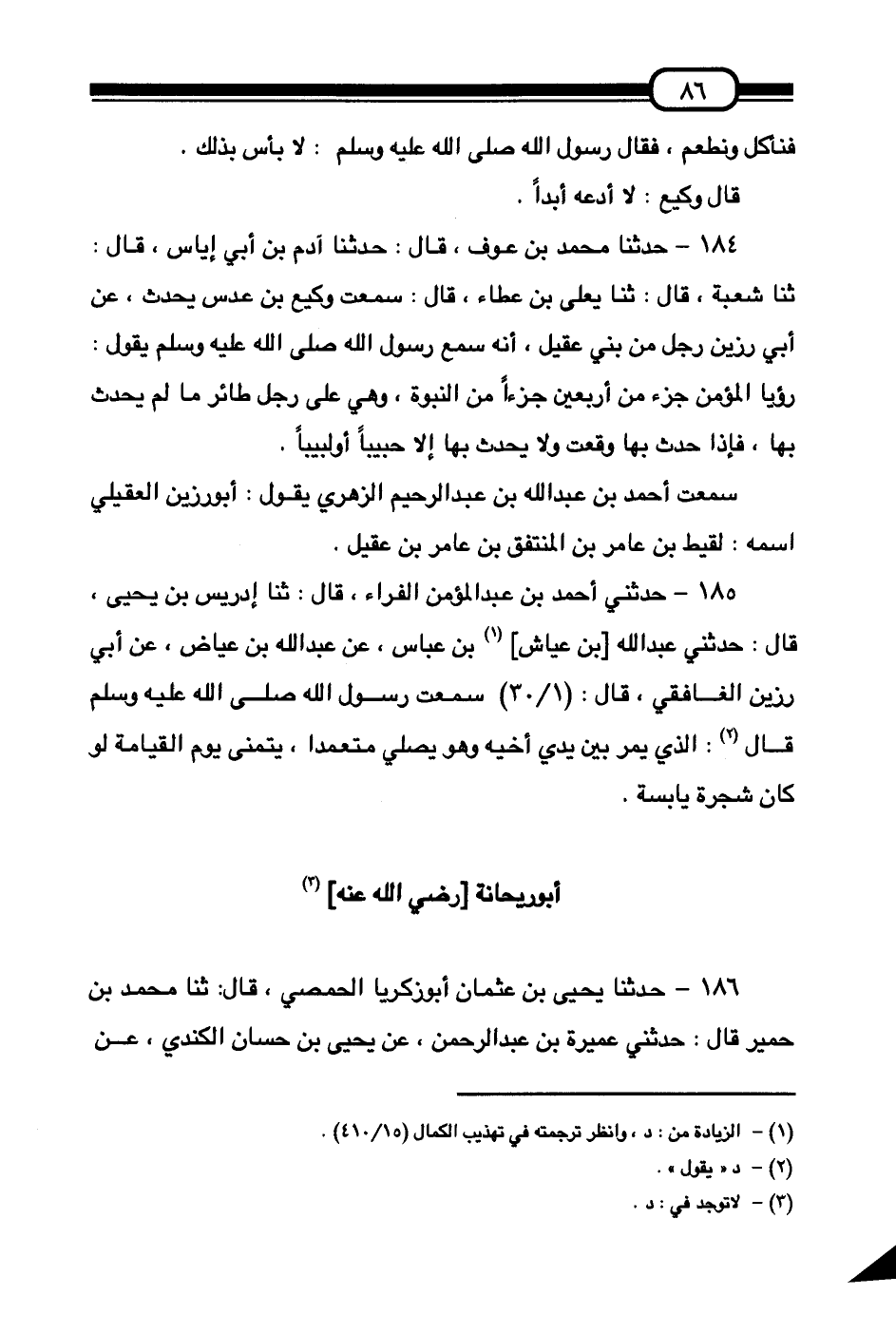 185 - حَدَّثَنِي أَحْمَدُ بْنُ عَبْدِ الْمُؤْمِنِ الْفَرَّاءُ قَالَ:، ثَنَا إِدْرِيسُ بْنُ يَحْيَى قَالَ: حَدَّثَنِي عَبْدُ اللَّهِ بْنُ عَيَّاشِ بْنِ عَبَّاسٍ، عَنْ عَبْدِ اللَّهِ بْنِ عِيَاضٍ عَنْ أَبِي رَزِينٍ الْغَافِقِيِّ قَالَ: سَمِعْتُ رَسُولَ اللَّهِ صَلَّى اللهُ عَلَيْهِ وَسَلَّمَ قَالَ: «§الَّذِي يَمُرُّ بَيْنَ يَدَيْ أَخِيهِ وَهُوَ يُصَلِّي مُتَعَمِّدًا يَتَمَنَّى يَوْمَ الْقِيَامَةِ لَوْ كَانَ شَجَرَةً يَابِسَةً»