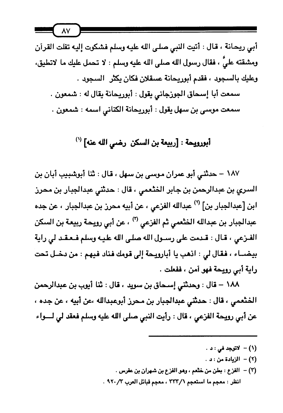 187 - حَدَّثَنِي أَبُو عِمْرَانَ مُوسَى بْنُ سَهْلٍ قَالَ:، ثَنَا أَبُو شَبِيبٍ أَبَانُ بْنُ السَّرِيِّ بْنِ عَبْدِ الرَّحْمَنِ بْنِ جَابِرٍ الْخَثْعَمِيُّ قَالَ: حَدَّثَنِي عَبْدُ الْجَبَّارِ بْنُ مُحْرِزِ بْنِ عَبْدِ الْجَبَّارِ بْنِ عَبْدِ اللَّهِ الْفَزَعِيُّ، عَنْ أَبِيهِ مُحْرِزِ بْنِ عَبْدِ الْجَبَّارِ، عَنْ جَدِّهِ عَبْدِ الْجَبَّارِ بْنِ عَبْدِ اللَّهِ الْخَثْعَمِيِّ ثُمَّ الْفَزَعِيِّ , عَنْ أَبِي رُوَيْحَةَ رَبِيعَةَ بْنِ السَّكَنِ الْفَزَعِيِّ قَالَ: قَدِمْتُ عَلَى رَسُولِ اللَّهِ صَلَّى اللهُ عَلَيْهِ وَسَلَّمَ فَعَقَدَ لِي رَايَةً بَيْضَاءَ فَقَالَ لِي: «§اذْهَبْ يَا أَبَا رُوَيْحَةَ إِلَى قَوْمِكَ فَنَادِ فِيهِمْ مَنْ دَخَلَ تَحْتَ رَايَةِ أَبِي رُوَيْحَةَ فَهُوَ آمِنٌ» فَفَعَلْتُ