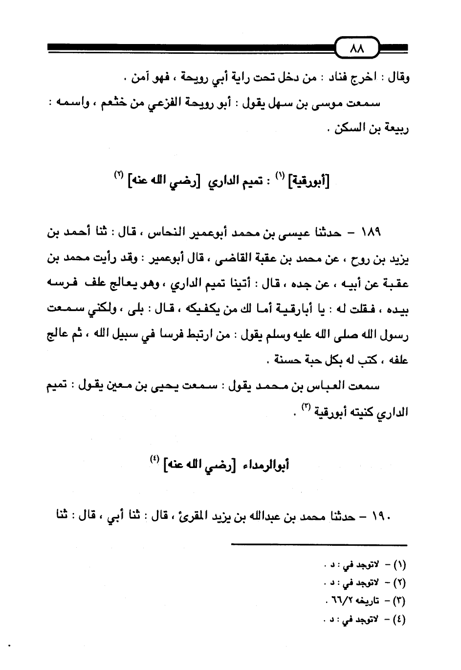189 - حَدَّثَنَا عِيسَى بْنُ مُحَمَّدٍ أَبُو عُمَيْرٍ النَّحَّاسُ قَالَ:، ثَنَا أَحْمَدُ بْنُ يَزِيدَ بْنِ رَوْحٍ، عَنْ مُحَمَّدِ بْنِ عُقْبَةَ الْقَاضِي - قَالَ أَبُو عُمَيْرٍ: وَقَدْ رَأَيْتُ مُحَمَّدَ بْنَ عُقْبَةَ - عَنْ أَبِيهِ , عَنْ جَدِّهِ قَالَ: أَتَيْنَا تَمِيمًا الدَّارِيَّ وَهُوَ يُعَالِجُ عَلَفَ فَرَسِهِ بِيَدِهِ فَقُلْتُ لَهُ: يَا أَبَا رُقَيَّةَ أَمَا لَكَ مَنْ يَكْفِيكَهُ؟ قَالَ: بَلَى وَلَكِنِّي سَمِعْتُ رَسُولَ اللَّهِ صَلَّى اللهُ عَلَيْهِ وَسَلَّمَ يَقُولُ: «§مَنِ ارْتَبَطَ فَرَسًا فِي سَبِيلِ اللَّهِ ثُمَّ عَالَجَ عَلَفَهُ كُتِبَ لَهُ بِكُلِّ حَبَّةٍ حَسَنَةٌ» . سَمِعْتُ الْعَبَّاسَ بْنَ مُحَمَّدٍ يَقُولُ: سَمِعْتُ يَحْيَى بْنَ مَعِينٍ يَقُولُ: «تَمِيمٌ الدَّارِيُّ كُنْيَتُةُ أَبُو رُقَيَّةَ»