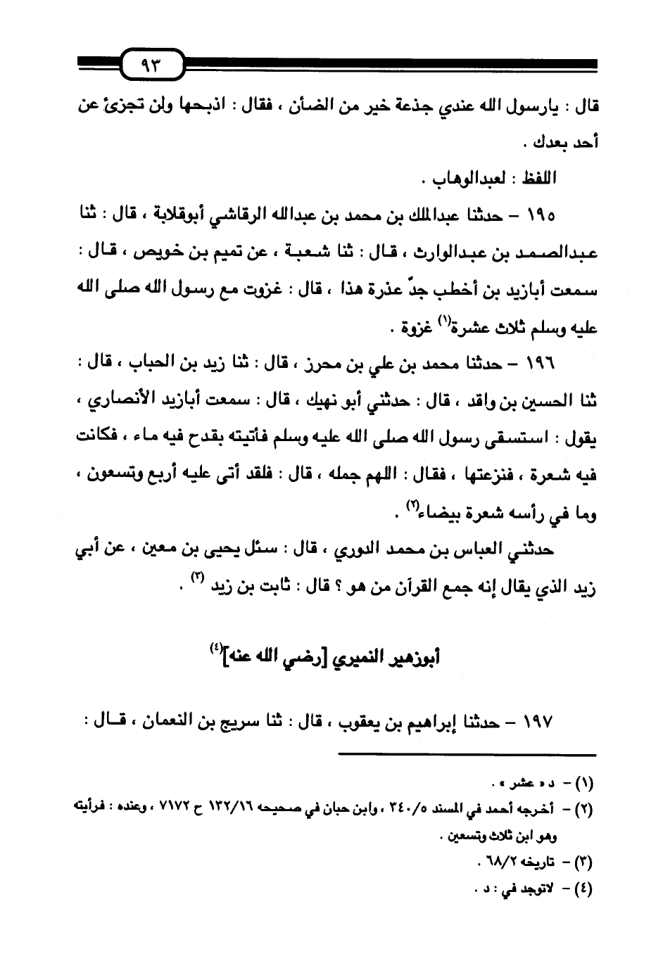 195 - حَدَّثَنَا عَبْدُ الْمَلِكِ بْنُ مُحَمَّدِ بْنِ عَبْدِ اللَّهِ الرَّقَاشِيُّ أَبُو قِلَابَةَ قَالَ:، ثَنَا عَبْدُ الصَّمَدِ بْنُ عَبْدِ الْوَارِثِ قَالَ:، ثَنَا شُعْبَةُ، عَنْ تَمِيمِ بْنِ خُوَيْصٍ قَالَ: سَمِعْتُ أَبَا زَيْدِ بْنَ أَخْطَبَ جَدَّ عُذْرَةَ هَذَا قَالَ: «§غَزَوْتُ مَعَ رَسُولِ اللَّهِ صَلَّى اللهُ عَلَيْهِ وَسَلَّمَ ثَلَاثَ عَشْرَةَ غَزْوَةً»