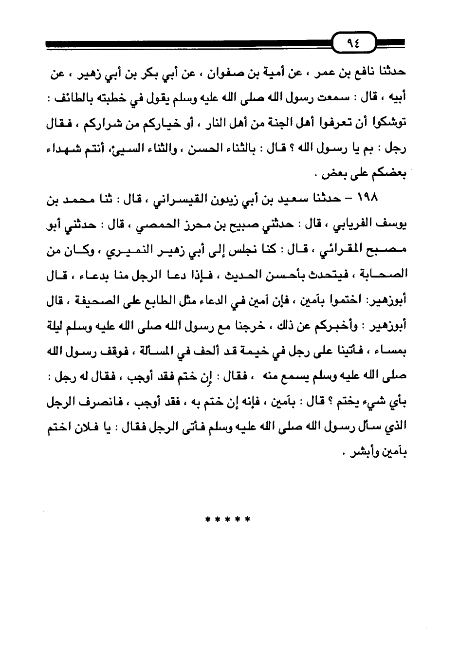 198 - حَدَّثَنَا سَعِيدُ بْنُ أَبِي زَيْدُونَ الْقَيْسَرَانِيُّ قَالَ:، ثَنَا مُحَمَّدُ بْنُ يُوسُفَ الْفِرْيَابِيُّ قَالَ: حَدَّثَنِي صُبَيْحُ بْنُ مُحْرِزٍ الْحِمْصِيُّ قَالَ: حَدَّثَنِي أَبُو مُصَبِّحٍ الْمَقْرَائِيُّ قَالَ: " كُنَّا نَجْلِسُ إِلَى أَبِي زُهَيْرٍ النُّمَيْرِيِّ وَكَانَ مِنَ الصَّحَابَةِ فَيَتَحَدَّثُ بِأَحْسَنِ الْحَدِيثِ فَإِذَا دَعَا الرَّجُلُ مِنَّا بِدُعَاءٍ قَالَ أَبُو زُهَيْرٍ: §اخْتِمُوا بِآمِينَ؛ فَإِنَّ آمِينَ فِي الدُّعَاءِ مِثْلُ الطَّابَعِ عَلَى الصَّحِيفَةِ، قَالَ أَبُو زُهَيْرٍ: وَأُخْبِرُكُمْ عَنْ ذَلِكَ خَرَجْنَا مَعَ رَسُولِ اللَّهِ صَلَّى اللهُ عَلَيْهِ وَسَلَّمَ لَيْلَةً بِمَسَاءٍ، فَأَتَيْنَا عَلَى رَجُلٍ فِي خَيْمَةٍ قَدْ أَلْحَفَ فِي الْمَسْأَلَةِ، فَوَقَفَ رَسُولُ اللَّهِ صَلَّى اللهُ عَلَيْهِ وَسَلَّمَ يَسْمَعُ مِنْهُ، فَقَالَ: «إِنْ خَتَمَ فَقَدْ أَوْجَبَ» . فَقَالَ لَهُ رَجُلٌ: بِأَيِّ شَيْءٍ يَخْتِمُ؟ قَالَ: «بِآمِينَ؛ فَإِنَّهُ إِنْ خَتَمَ بِهِ فَقَدْ أَوْجَبَ» . فَانْصَرَفَ الرَّجُلُ الَّذِي سَأَلَ رَسُولَ اللَّهِ صَلَّى اللهُ عَلَيْهِ وَسَلَّمَ، فَأَتَى الرَّجُلَ فَقَالَ: يَا فُلَانُ اخْتِمْ بِآمِينَ وَأَبْشِرْ "