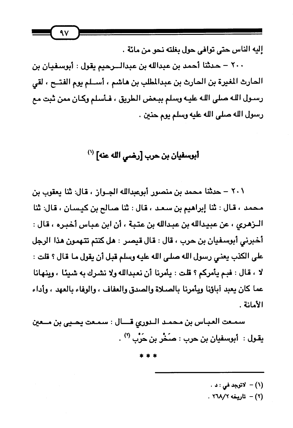201 - حَدَّثَنَا مُحَمَّدُ بْنُ مَنْصُورٍ أَبُو عَبْدِ اللَّهِ الْجَوَّازُ قَالَ:، ثَنَا يَعْقُوبُ بْنُ مُحَمَّدٍ قَالَ:، ثَنَا إِبْرَاهِيمُ بْنُ سَعْدٍ قَالَ:، ثَنَا صَالِحُ بْنُ كَيْسَانَ قَالَ:، ثَنَا الزُّهْرِيُّ، عَنْ عُبَيْدِ اللَّهِ بْنِ عَبْدِ اللَّهِ بْنِ عُتْبَةَ أَنَّ ابْنَ عَبَّاسٍ أَخْبَرَهُ قَالَ: أَخْبَرَنِي أَبُو سُفْيَانَ بْنُ حَرْبٍ قَالَ: قَالَ قَيْصَرُ: هَلْ كُنْتُمْ تَتَّهِمُونَ هَذَا الرَّجُلَ عَلَى الْكَذِبِ - يَعْنِي رَسُولَ اللَّهِ صَلَّى اللهُ عَلَيْهِ وَسَلَّمَ - قَبْلَ أَنْ يَقُولَ مَا قَالَ؟ قُلْتُ: لَا. قَالَ: فَبِمَ يَأْمُرُكُمْ؟ قُلْتُ: «§يَأْمُرُنَا أَنْ نَعْبُدَ اللَّهَ وَلَا نُشْرِكَ بِهِ شَيْئًا وَيَنْهَانَا عَمَّا كَانَ يَعْبُدُ آبَاؤُنَا وَيَأْمُرُنَا بِالصَّلَاةِ وَالصِّدْقِ وَالْعَفَافِ وَالْوَفَاءِ بِالْعَهْدِ وَأَدَاءِ الْأَمَانَةِ» . سَمِعْتُ الْعَبَّاسَ بْنَ مُحَمَّدٍ الدُّورِيَّ قَالَ: سَمِعْتُ يَحْيَى بْنَ مَعِينٍ يَقُولُ: " أَبُو سُفْيَانَ بْنُ حَرْبٍ: صَخْرُ بْنُ حَرْبٍ "