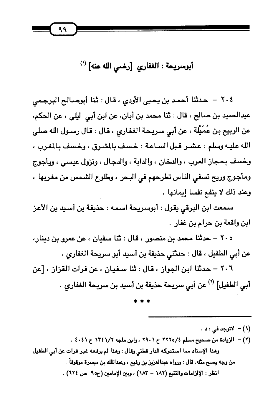 204 - حَدَّثَنَا أَحْمَدُ بْنُ يَحْيَى الْأَوْدِيُّ قَالَ:، ثَنَا أَبُو صَالِحٍ الْبُرْجُمِيُّ عَبْدُ الْحَمِيدِ بْنُ صَالِحٍ قَالَ:، ثَنَا مُحَمَّدُ بْنُ أَبَانَ عَنِ ابْنِ أَبِي لَيْلَى عَنِ الْحَكَمِ عَنِ الرَّبِيعِ بْنِ عَمِيلَةَ عَنْ أَبِي سَرِيحَةَ الْغِفَارِيِّ قَالَ: قَالَ رَسُولُ اللَّهِ صَلَّى اللهُ عَلَيْهِ وَسَلَّمَ: " §عَشْرٌ قَبْلَ السَّاعَةِ: خَسْفٌ بِالْمَشْرِقِ , وَخَسْفٌ بِالْمَغْرِبِ , وَخَسْفٌ بِحِجَازِ الْعَرَبِ , وَالدُّخَانُ , وَالدَّابَّةُ , وَالدَّجَّالُ , وَنُزُولُ عِيسَى , وَيَأْجُوجُ , وَمَأْجُوجُ , وَرِيحٌ تَسْفِي النَّاسَ تَطْرَحُهُمْ فِي الْبَحْرِ , وَطُلُوعُ الشَّمْسِ مِنْ مَغْرِبِهَا وَعِنْدَ ذَلِكَ لَا يَنْفَعُ نَفْسًا إِيمَانُهَا " سَمِعْتُ ابْنَ الْبَرْقِيِّ يَقُولُ: أَبُو سَرِيحَةَ اسْمُهُ حُذَيْفَةُ بْنُ أُسَيْدِ بْنِ الْأَعَزِّ بْنِ وَاقِعَةَ بْنِ حَرَامِ بْنِ غِفَارٍ.