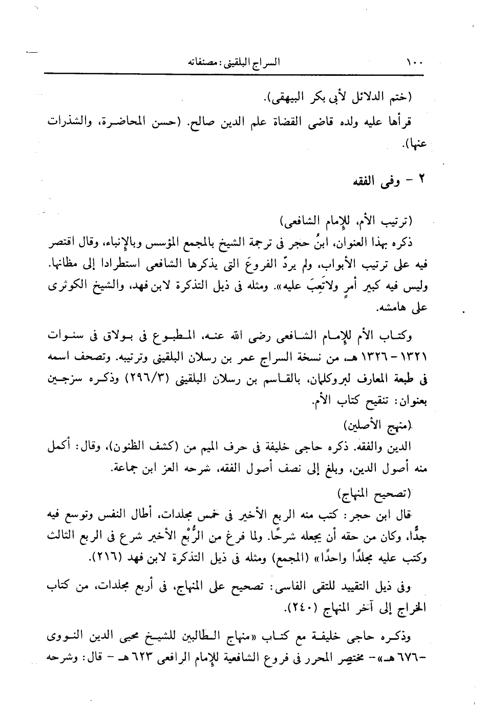 وكتاب الأم للإِمام الشافعي - رضي الله عنه -، المطبوع في بولاق في سنوات 1321 - 1326 هـ - من نسخة السراج عمر بن رسلان البلقيني وترتيبه. وتصحف اسمه في طبعة المعارف لبروكلمان: بالقاسم بن رسلان البلقيني (3/ 296) وذكره سزجين بعنوان: تنقيح كتاب الأم.