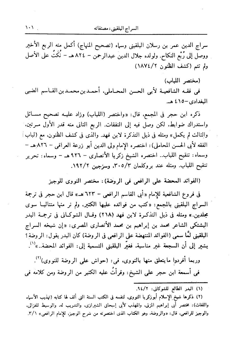 في فروع الشافعية للإِمام " أبي القاسم الرافعي - 623 هـ - "، قال ابن حجر في ترجمة السراج البلقيني بالمجمع: " كتب من فوائده عليها الكثير، ولم نر متتاليا سوى مجلدين. " ومثله في ذيل التذكرة لابن فهد (218)، وقال الشوكاني في ترجمة البدر البشتكي الشاعر محمد بن إبراهيم بن محمد الأنصاري المصري: " إن شيخه السراج البلقيني لمَّا سمى (الفوائد المنهضة على الرافعي في الروضة) كان البدر يقول: الروضة؟ يشير إلى أن السجعة غير مناسبة، فغيّر البلقيني التسمية إلى: الفوائد المحضة .. " (1).
