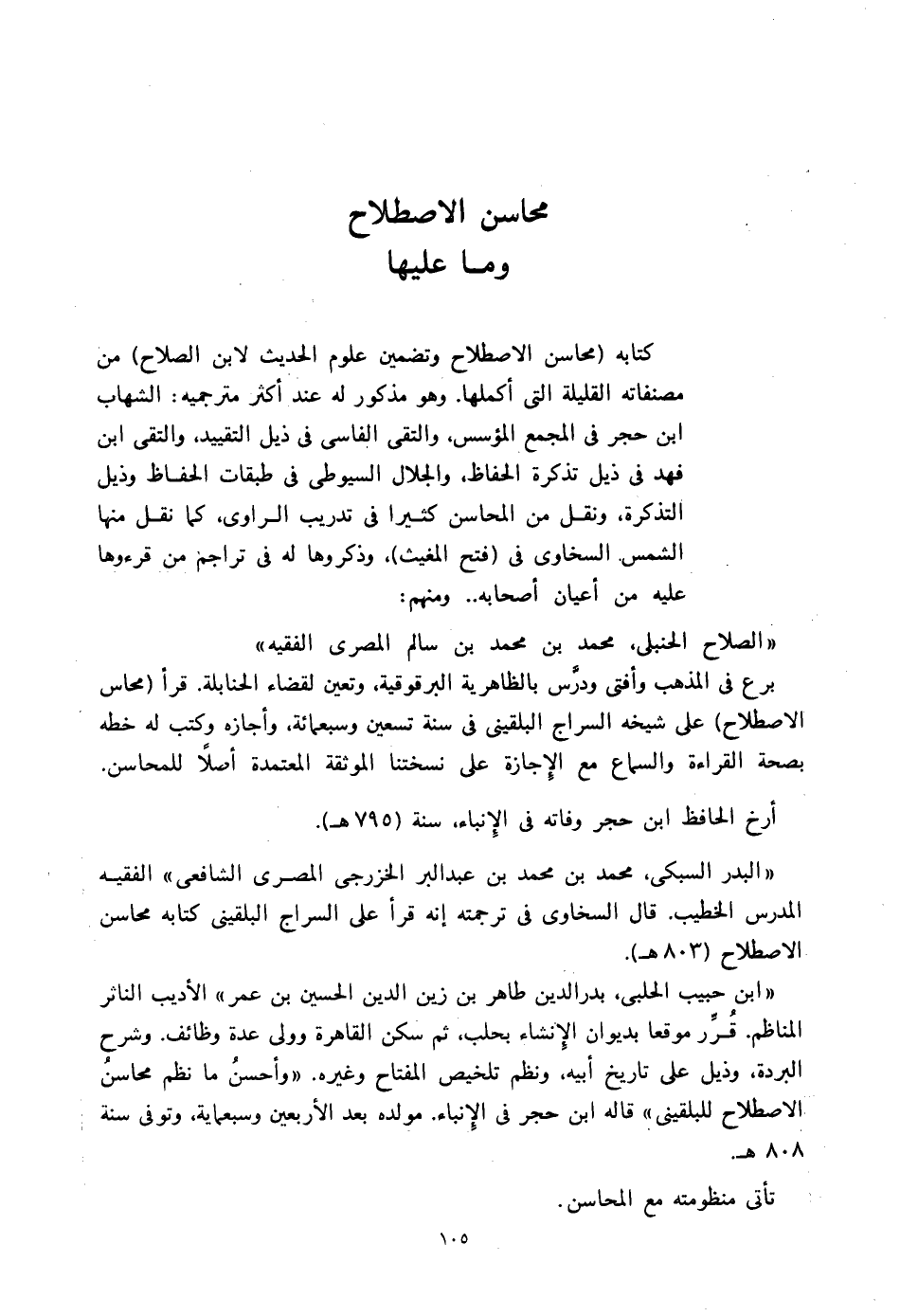 " البدر السبكي، محمد بن محمد بن عبدالبر الخزرجي المصري الشافعي " الفقيه المدرس الخطيب. قال السخاوي في ترجمته أنه قرأ على السراج البلقيني كتابه محاسن الاصطلاح (803 هـ).
