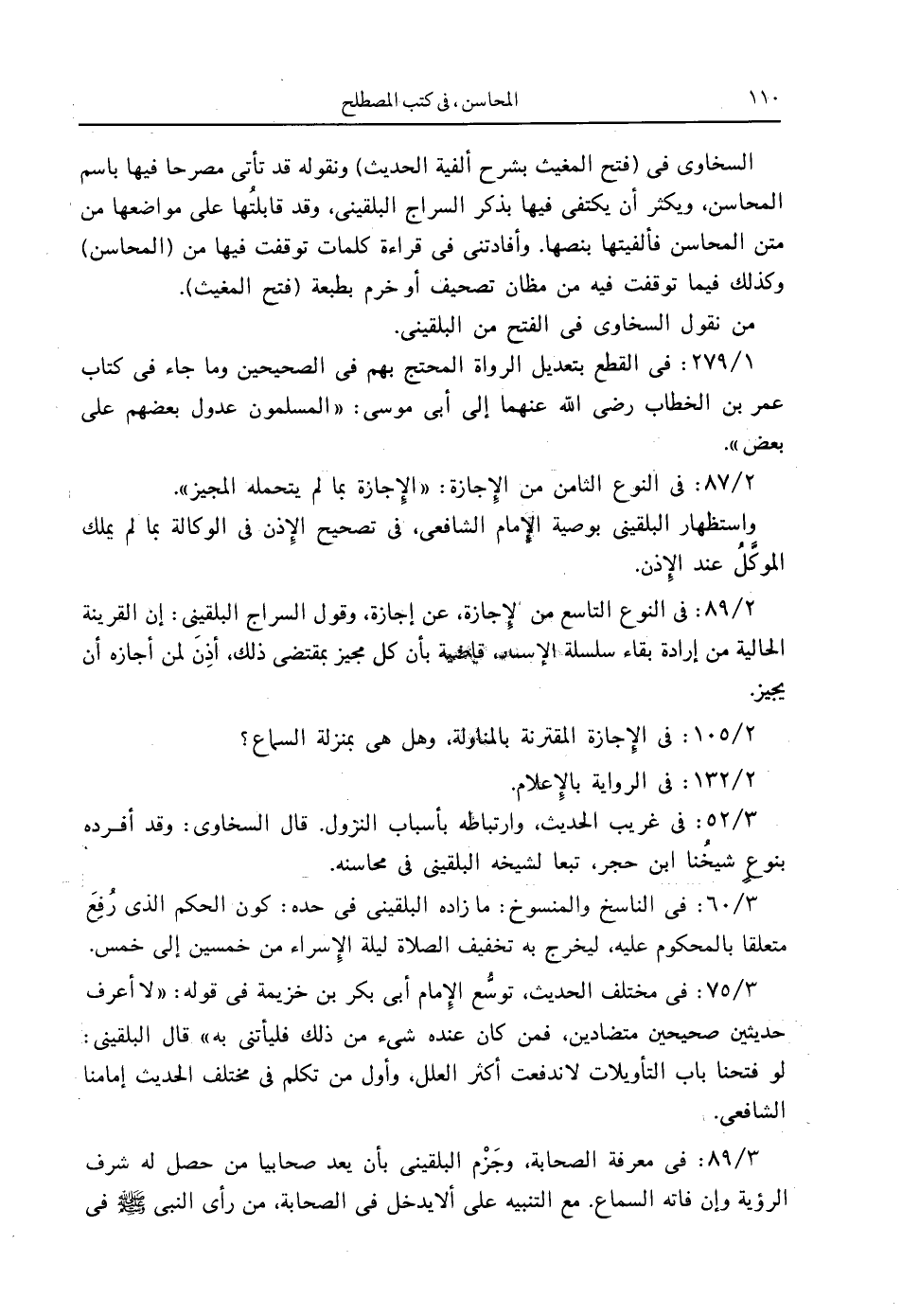 2/ 89: في النوع التاسع من الإِجازة، عن إجازة، وقول السراج البلقيني: إن القرينة الحالية من إرادة بقاء سلسلة الإسناد قاضية بأن كل مجيز بمقتضى ذلك، أذِنَ لمن أجازه أن يجيز.