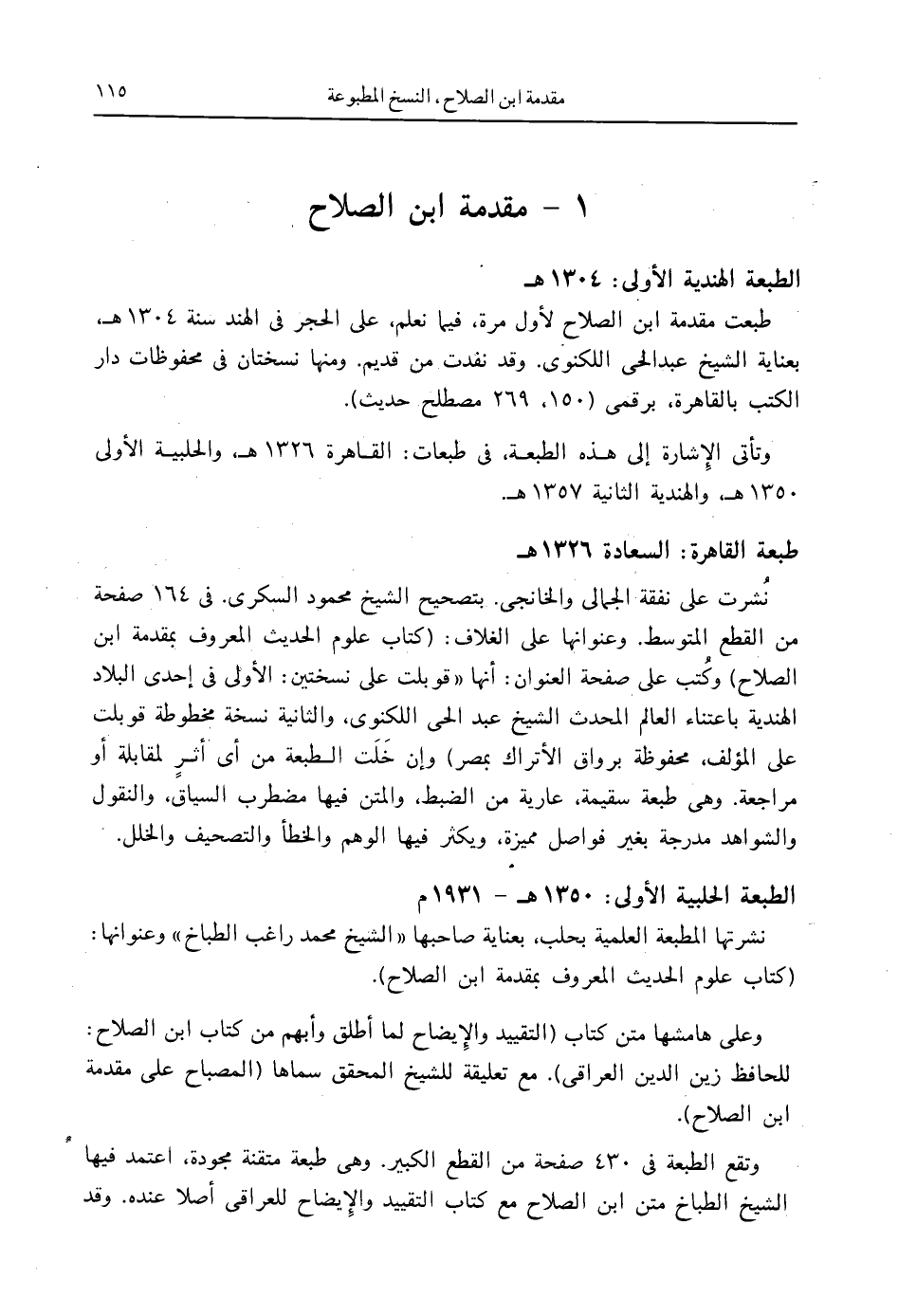 نشرتها المطبعة العلمية بحلب، بعناية صاحبها " الشيخ محمد راغب الطباخ " وعنوانها: (كتاب علوم الحديث المعروف بمقدمة ابن الصلاح).