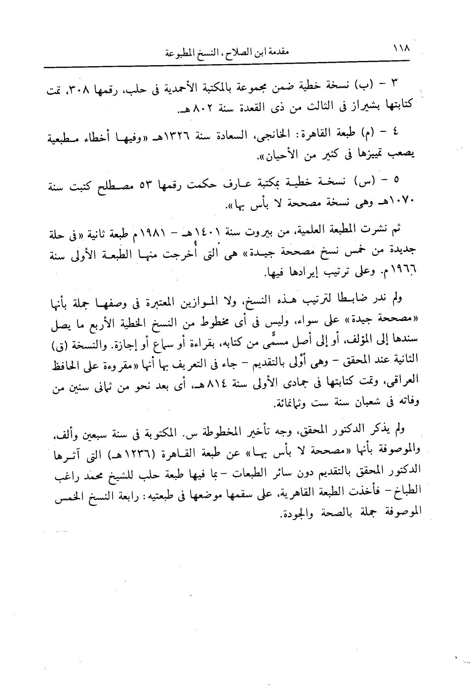 ولم يذكر الدكتور المحقق، وجه تأخير المخطوطة (س) المكتوبة في سنة سبعين وألف، والموصوفة بأنها " مصححة لا بأس بها " عن طبعة القاهرة (1236 هـ) التي آثرها الدكتور المحقق بالتقديم دون سائر الطبعات - بما فيها طبعة حلب للشيخ محمد راغب الطباخ - فأخذت الطبعة القاهرية، على سقمها موضعها في طبعتيه: رابعة النسخ الخمس الموصوفة جملة بالصحة والجودة.
