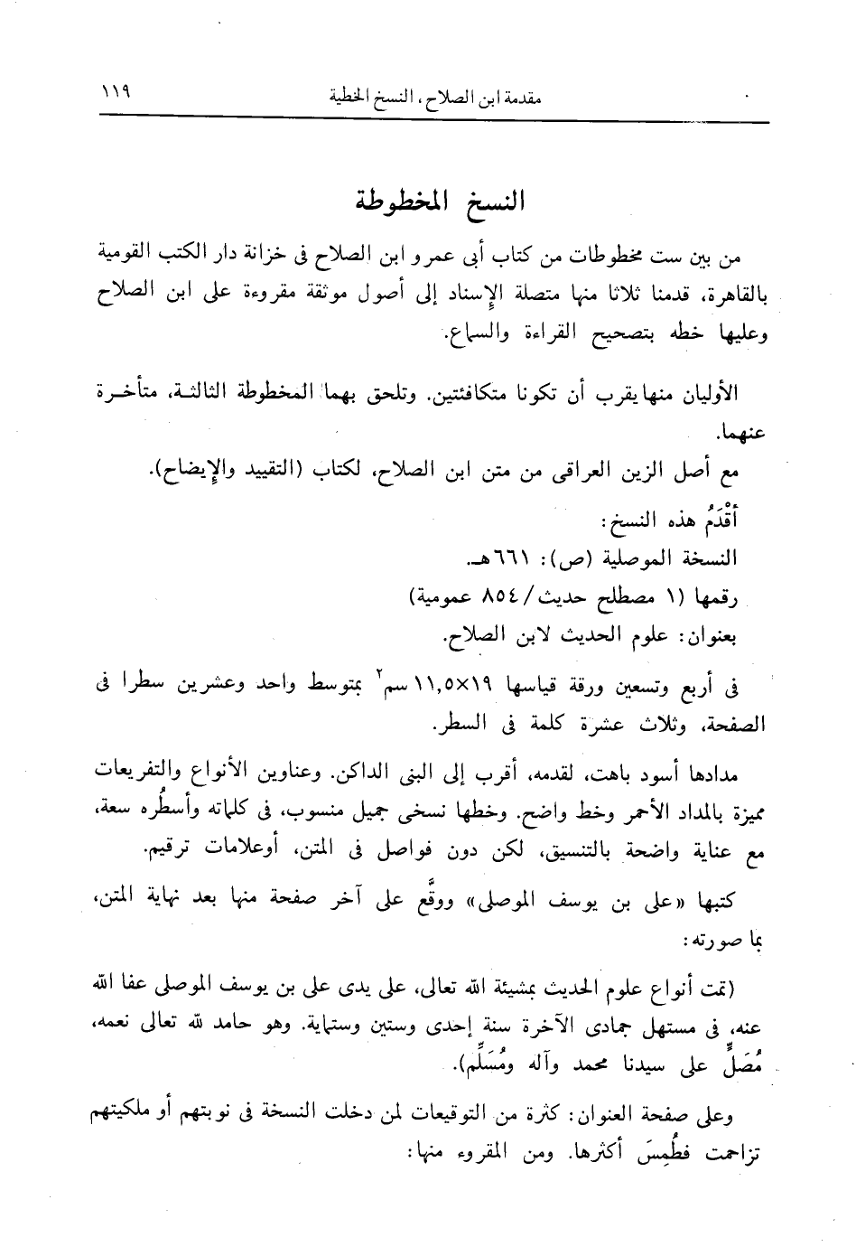 من بين ست مخطوطات من كتاب أبي عمرو ابن الصلاح في خزانة دار الكتب القومية بالقاهرة، قدمنا ثلاث منها متصلة الإِسناد إلى أصول موثقة مقروءة على ابن الصلاح وعليها خطه بتصحيح القراءة والسماع.