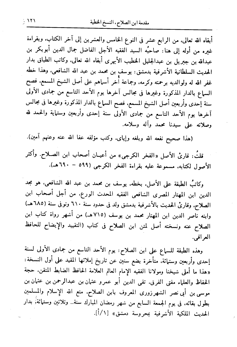 وهذه الطبقة للسماع على ابن الصلاح: يوم الأحد التاسع من جمادى الأولى لسنة إحدى وأربعين وستمائة، متأخرة بضع سنين عن تاريخ إملائها المقيد على أول النسخة: " هذا ما أملى شيخنا ومولانا الفقيه الإِمام العالم العلامة الحافظ الضابط المتقن، حجة الحفاظ والعلماء مفتي الفروق، تقي الدين أبو عمرو عثمان بن عبدالرحمن بن عثمان بن موسى بن أبي نصر الشهرزوري المعروف بابن الصلاح - متع الله الإِسلام والمسلمين بطول بقائه - في يوم الجمعة والسابع من شهر رمضان المبارك سنة .. وثلاثين وستمائة، بدار الحديث الملكية الأشرفية بمحروسة دمشق " [1 / أ].