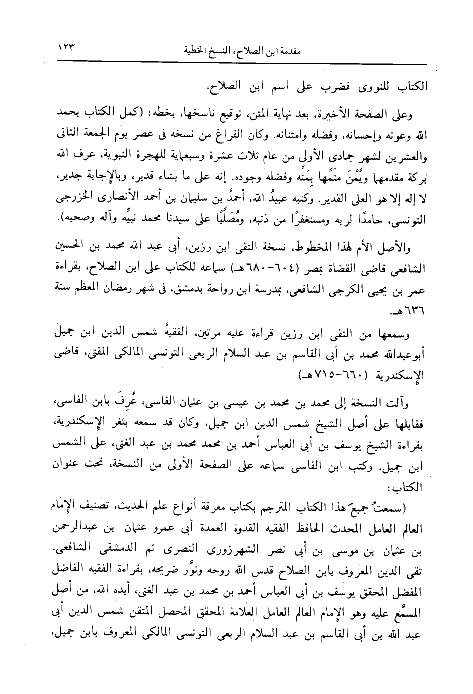 (سمعتُ جميعَ هذا الكتاب المترجم بكتاب معرفة أنواع علم الحديث، تصنيف الإِمام العالم العامل المحدث الحافظ الفقيه القدوة العمدة أبي عمرو عثمان بن عبدالرحمن بن عثمان بن موسى بن أبي نصر الشهرزوري النصري ثم الدمشقي الشافعي. تقي الدين المعروف بابن الصلاح - قدس الله روحه ونور ضريحه -، بقراءة الفقيه الفاضل المفضل المحقق يوسف بن أبي العباس أحمد بن محمد بن عبدالغني - أيده الله - من أصل المسمَّع عليه وهو الإِمام العالم العامل العلامة المحقق المحصل المتقن شمس الدين أبي عبدالله بن أبي القاسم بن عبدالسلام الربعي التونسي المالكي المعروف بابن جميل،