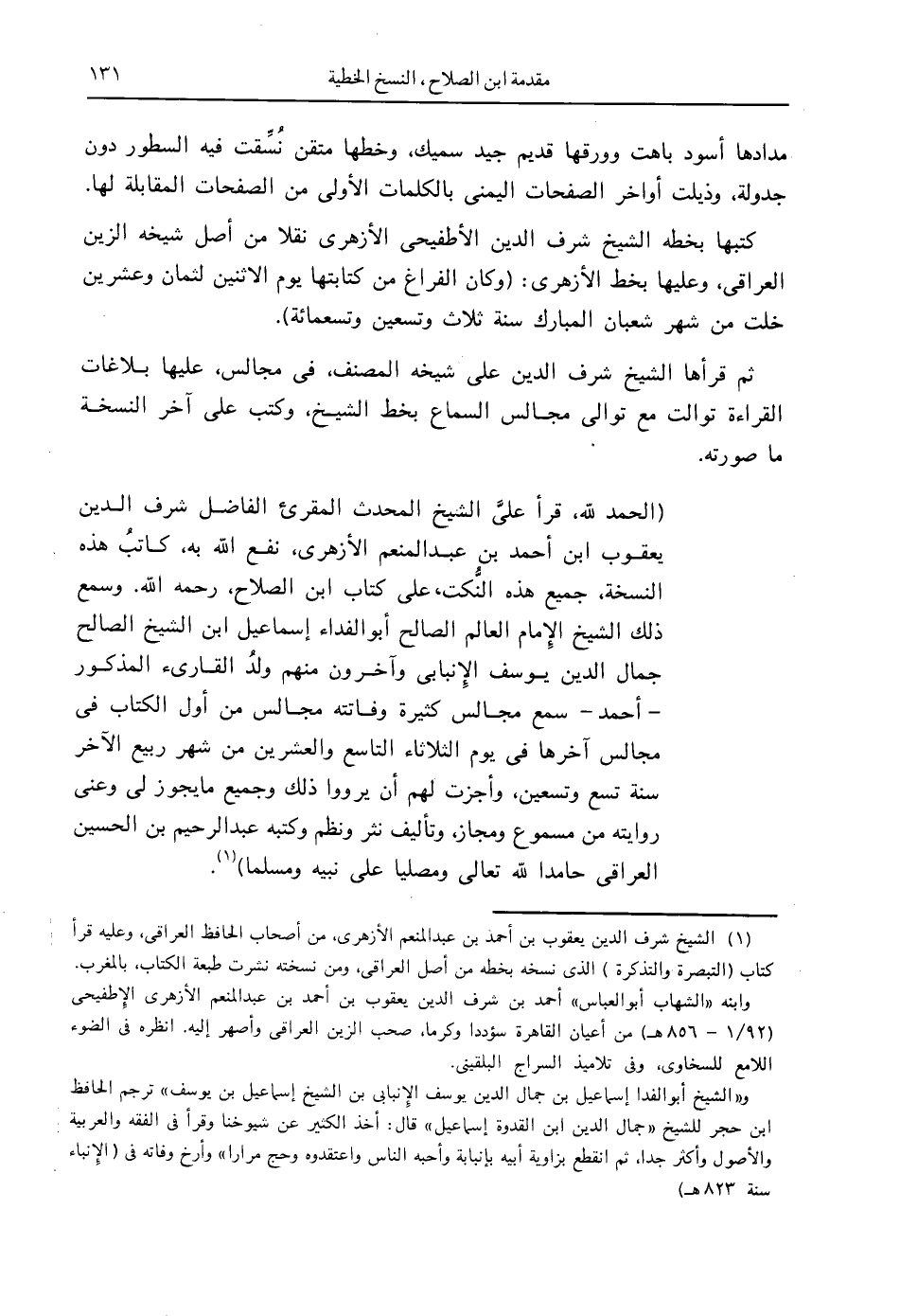 (الحمد لله، قرأ عليَّ الشيخ المحدث المقرئ الفاضل شرف الدين يعقوب بن أحمد بن عبدالمنعم الأزهري - نفع الله به - كاتبُ هذه النسخة، جميع هذه النُّكت على كتاب ابن الصلاح - رحمه الله -. وسمع ذلك الشيخ الإِمام العالم الصالح أبو الفداء إسماعيل ابن الشيخ الصالح جمال الدين يوسف الإِنبابي وآخرون منهم ولدُ القارئ المذكور - أحمد - سمع مجالس كثيرة وفاتته مجالس من أول الكتاب في مجالس آخرها في يوم الثلاثاء التاسع والعشرين من شهر ربيع الآخر سنة تسع وتسعين، وأجزت لهم أن يرووا ذلك وجميع ما يجوز لي وعني روايته من مسموع ومجاز، وتأليف نثر ونظم وكتبه عبدالرحمن بن الحسين العراقي حامدا الله تعالى ومصليا على نبيه ومسلما) (1).