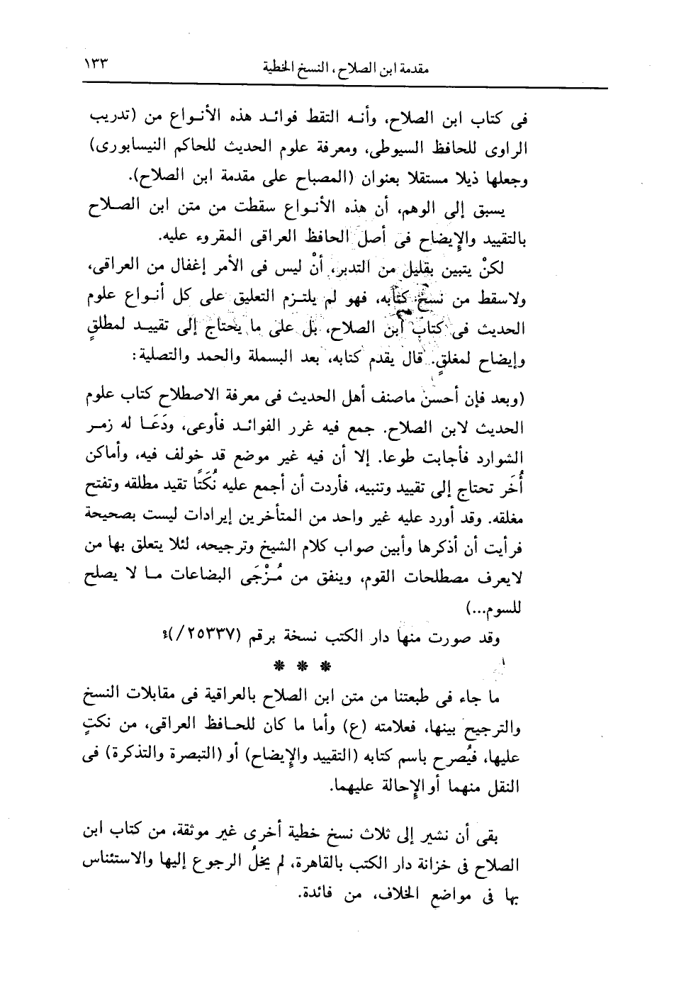 بقي أن نشير إلى ثلاث نسخ خطية أخرى غير موثقة، من كتاب ابن الصلاح في خزانة دار الكتب بالقاهرة، لم يخلُ الرجوع إليها والاستئناس بها في مواضع الخلاف من فائدة.