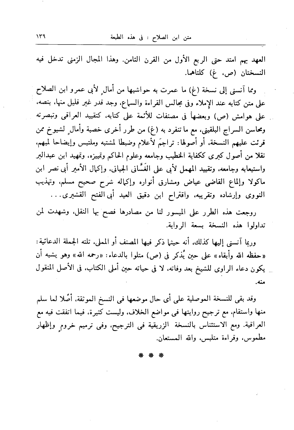 ومما آنسني إلى نسخة (غ) ما عمرت به حواشيها من أمال ٍ لأبي عمرو ابن الصلاح على متن كتابه عند الإِملاء وفي مجالس القراءة والسماع، وجد قدر غير قليل منها، بنصه، على هوامش (ص) وبعضها في مصنفات للأئمة على كتابه، كتقييد العراقي وتبصرته ومحاسن السراج البلقيني، مع ما تنفرد به (غ) من طرر أخرى خصبة وأمال ٍ لشيوخ ممن قرئت عليهم النسخة، أو أصولها، تراجمَ لأعلام وضبطا لمشتبه وملتبس وإيضاحا لمبهم، نقلا من أصول كبرى ككفاية الخطيب وجامعه وعلوم الحاكم وتمييزه، وتمهيد ابن عبدالبر واستيعابه وجامعه، وتقييد المهمل لأبي علي الغَسَّاني الجياني، وإكمال الأمير أبي نصر ابن ماكولا وإلماع القاضي عياض ومشارق أنواره، وإكماله شرح صحيح مسلم، وتهذيب النووي وإرشاده وتقريبه، واقتراح ابن دقيق العيد أبي الفتح القشيري ...