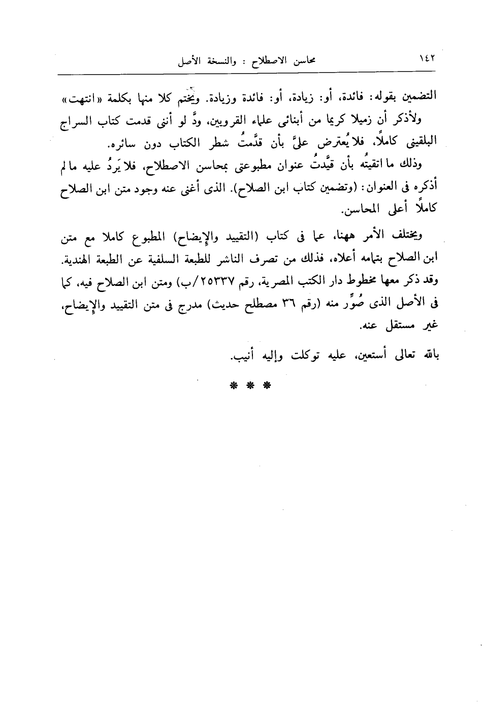 وذلك ما اتقيتُه بأن قيَّدتُ عنوان مطبوعتي بمحاسن الاصطلاح، فلا يَردُ عليه ما لم أذكره في العنوان: (وتضمين كتاب ابن الصلاح). الذي أغنى عنه وجود متن ابن الصلاح كاملاً أعلى المحاسن.