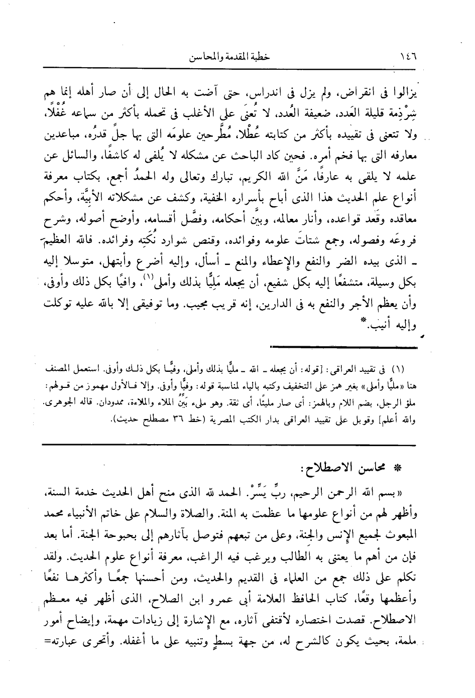يزالوا في انقراض، ولم يزل في اندراس، حتى آضت به الحال إلى أن صار أهله إنما وهم شِرْذِمة قليلة العَدد، ضعيفة العُدد، لا تُعنَى على الأغلب في تحمله بأكثر من سماعه غُفْلاً، ولا تتعنى في تقييده بأكثر من كتابته عُطْلاً، مُطَّرحين علومَه التي بها جلَّ قدرُه، مباعدين معارفه التي بها فخم أمره. فحين كاد الباحث عن مشكله لا يُلفى له كاشفًا، والسائل عن علمه لا يلقى به عارفًا، مَنَّ الله الكريم، تبارك وتعالى وله الحمدُ أجمع، بكتاب معرفة أنواع علم الحديث هذا الذي أباح بأسراره الخفية، وكشف عن مشكلاته الأبِيَّة، وأحكم معاقده وقَعد قواعده، وأثار معالمه، وبيَّن أحكامه، وفصَّل أقسامه، وأوضح أصوله، وشرح فروعَه وفصوله، وجمع شتاتَ علومه وفوائده، وقنص شوارد نُكَتِه وفرائده. فالله العظيمَ - الذي بيده الضر والنفع والإِعطاء والمنع - أسأل، وإليه أضرع وأبتهل، متوسلا إليه بكل وسيلة، متشفعًا إليه بكل شفيع، أن يجعله مَلِيًّا بذلك وأملى (1)، وافيًا بكل ذلك وأوفى "، وأن يعظم الأجر والنفع به في الدارين، إنه قريب مجيب. وما توفيقي إلا بالله عليه توكلت وإليه أنيب *.