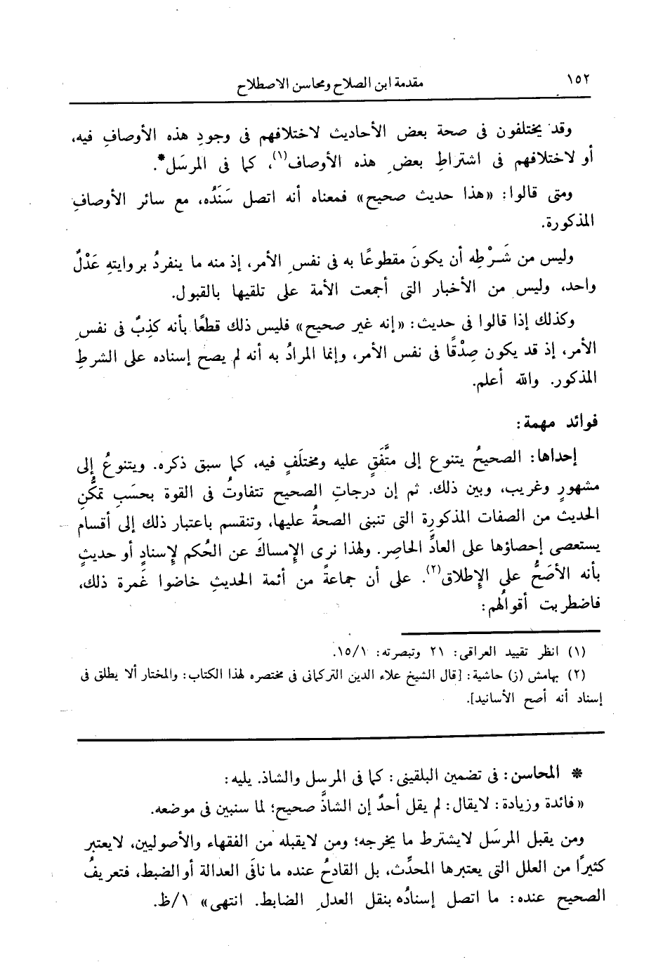 ومن يقبل المرسلَ لا يشترط ما يخرجه؛ ومن لا يقبله من الفقهاء والأصوليين، لا يعتبر كثيرًا من العلل التي يعتبرها المحدِّث، بل القادحُ عنده ما نافَى العدالة أو الضبط، فتعريفُ الصحيح عنده: ما اتصل إسنادُه بنقل العدل ِ الضابط. انتهى " 1 / ظ.