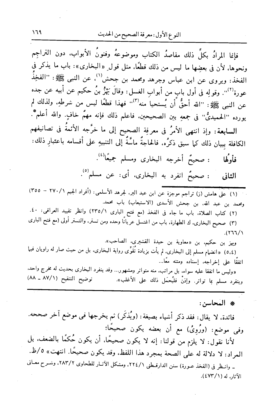 فإنما المرادُ بكلِّ ذلك مقاصدُ الكتاب وموضوعُه وفنونُ الأبواب، دون التراجم ونحوها، لأن في بعضِها ما ليس من ذلك قطعًا، مثل قول ِ " البخاري ": باب ما يذكر في الفخذ: ويروى عن ابن عباس وجرهد ومحمد بن جحش (1)، عن النبي - صلى الله عليه وسلم -: " الفخِذُ عورة (2) ". وقولِه في أول بابٍ من أبوابِ الغسل: وقالَ بَهْزٌ بنُ حكيم عن أبيه عن جده عن النبي - صلى الله عليه وسلم -: " الله أحقُّ أن يُستحيا منه (3) " فهذا قطعًا ليس من شرطِه، ولذلك لم يورده " الحميديُّ " في جمعِه بين الصحيحين، فاعلم ذلك فإنه مهمٌ خافٍ، والله أعلم *.