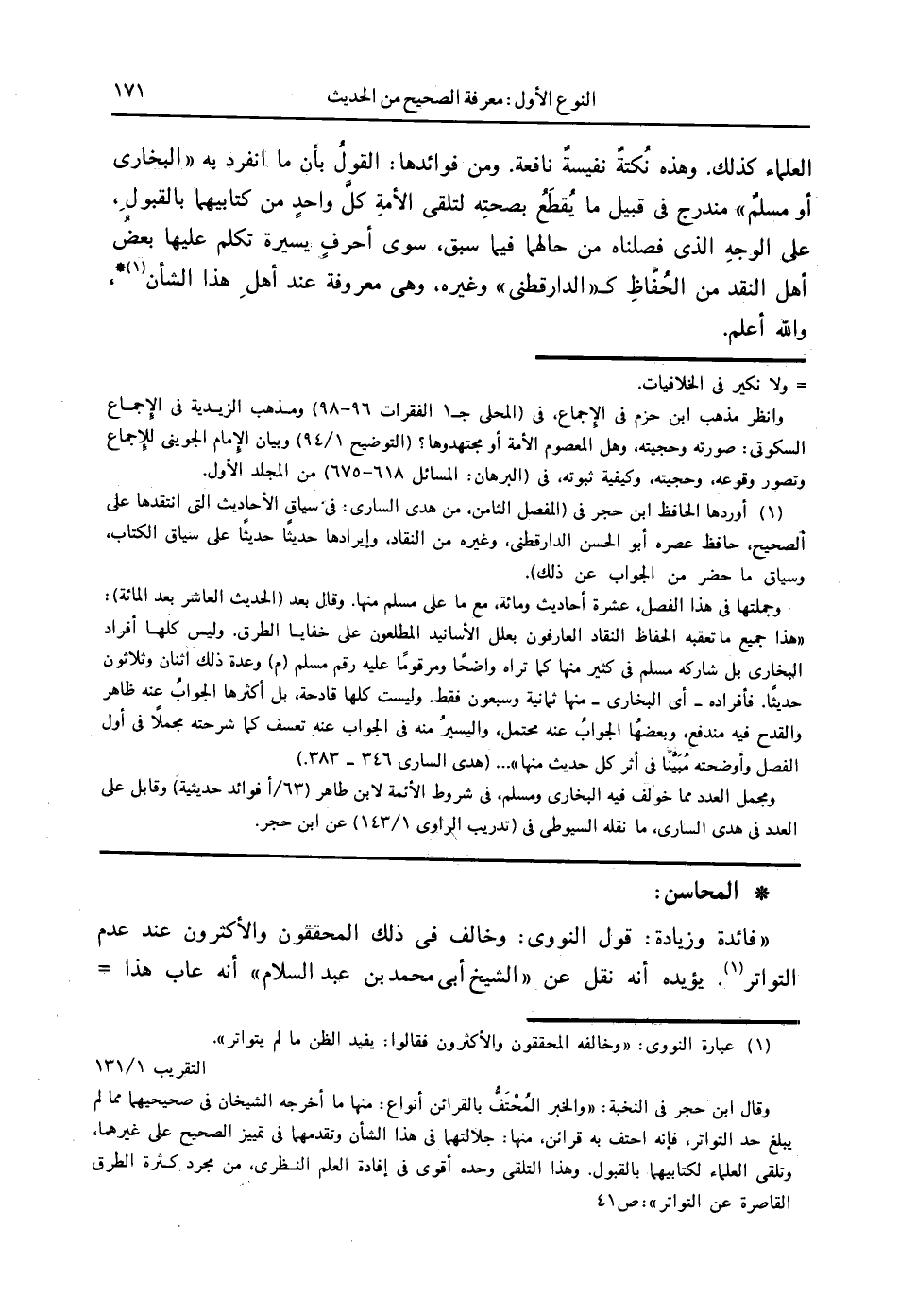 العلماء كذلك. وهذه نُكتةٌ نفيسةٌ نافعة. ومن فوائدها: القول بأن ما انفرد به " البخاري أو مسلمٌ " مندرج في قبيل ما يُقطَعُ بصحتِه لتلقي الأمةِ كلَّ واحدٍ من كتابيهما بالقبول ِ، على الوجهِ الذي فصلناه من حالهما فيما سبق، سوى أحرفٍ يسيرة تكلم عليها بعضُ أهل النقد من الحُفَّاظِ كـ" الدارقطني " وغيره، وهي معروفة عند أهل ِ هذا الشأن (1) *، والله أعلم.