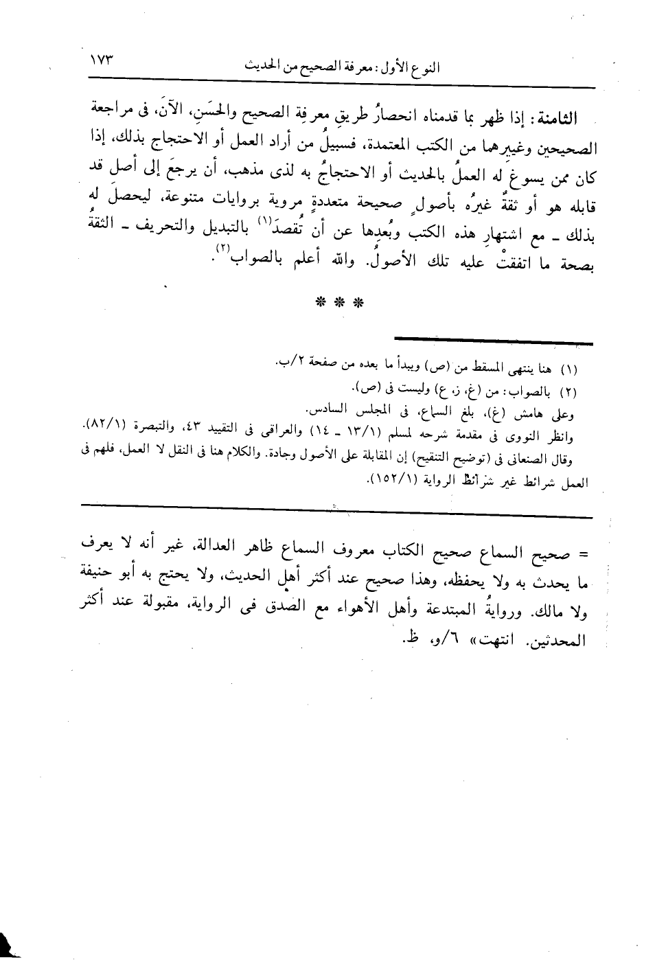 الثامنة: إذا ظهر بما قدمناه انحصارُ طريقِ معرفةِ الصحيح والحسَنِ، الآنَ، في مراجعة الصحيحين وغيرِهما من الكتب المعتمدة، فسبيلُ من أراد العمل أو الاحتجاج بذلك، إذا كان ممن يسوغ له العملُ بالحديث أو الاحتجاجُ به لذي مذهب، أن يرجعَ إلى أصل قد قابله هو أو ثقةٌ غيرُه بأصول ٍ صحيحة متعددةٍ مروية بروايات متنوعة، ليحصلَ له بذلك - مع اشتهارِ هذه الكتب وبُعدِها عن أن تُقصدَ (1) بالتبديل والتحريف - الثقةُ بصحة ما اتفقتْ عليه تلك الأصولُ. والله أعلم بالصواب (2)