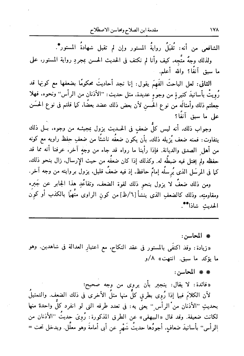 الثاني: لعل الباحثَ الفَهِمَ يقول: إنا نجد أحاديثَ محكومًأ بضعفها مع كونِها قد رُوِيتْ بأسانيدَ كثيرةٍ من وجوهٍ عديدة، مثل حديث: " الأذنان من الرأس " ونحوه، فهلا جعلتم ذلك وأمثالَه من نوع الحسنِ لأن بعض ذلك عضد بعضًا، كما قلتم في نوع الحسَن على ما سبق آنفًا؟