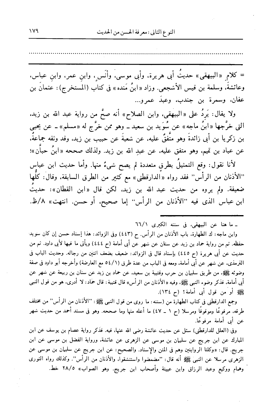ولا يقال: يَرِدُ على " البيهقي، وابن الصلاح " أنه صحَّ من رواية عبدالله بن زيد، التي خرَّجها " ابنُ ماجة " عن سُوَيد بن سعيد - وهو ممن خرَّج له " مسلم " - عن يحيى بن زكريا بن أبي زائدةَ - وهو متَّفقٌ عليه - عن شعبةَ عن حبيب بن زيد - وقد وثقه جماعةٌ - عن عباد بن تميم - وهو متفق عليه - عن عبدالله بن زيد. ولذلك صححه " ابنُ حبَّان "؛ لأنا نقول: وقع التمثيلُ بطرقٍ متعددة لم يصح شيءٌ منها. وأما حديث ابن عباس " الأذنان من الرأس " فقد رواه " الدارقطني " مع كثير من الطرق السابقة، وقال: كلُّها ضعيفة. ولم يروه من حديث عبدالله بن زيد، لكن قال " ابن القطان ": حديثُ ابن عباس الذي فيه " الأذنان من الرأس " إما صحيح، أو حسن. انتهت " 8 / ظ.
