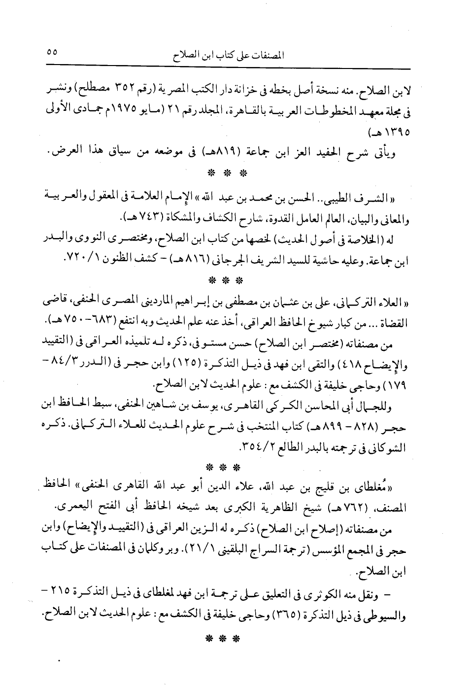 - ونقل منه الكوثري في التعليق على ترجمة ابن فهد لمغلطاي في ذيل التذكرة 215، والسيوطي في ذيل التذكرة (365) وحاجي خليفة في الكشف مع: علوم الحديث لابن الصلاح.